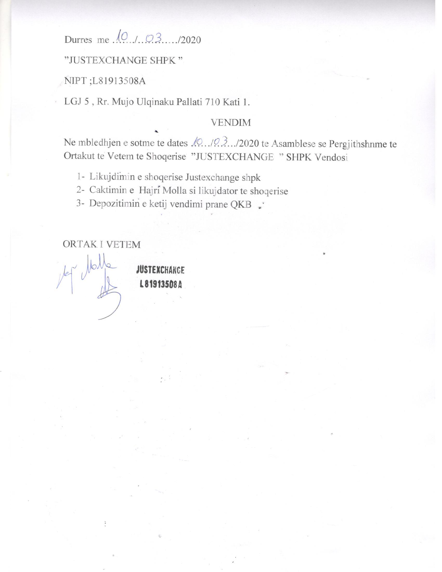 → Ekstrakti Historik i Regjistrit Tregtar date 08.11.2022 → Akt themelimi i Shoqerise → Vendim i Ortakut te Vetem, Likuidim Shoqerie date 10.03.2020 |