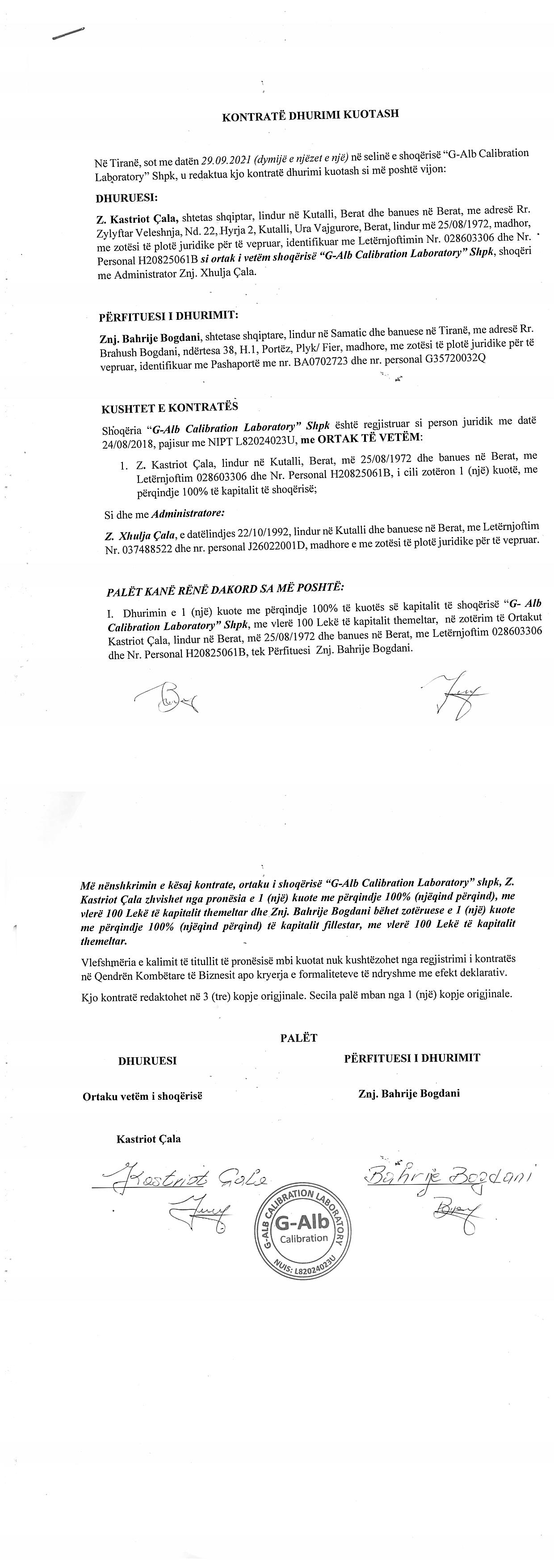 → Ekstrakti Historik i Regjistrit Tregtar date 16.11.2022 → Statuti i Shoqerise → Kontrate Dhurimi Kuotash date 29.09.2021 |