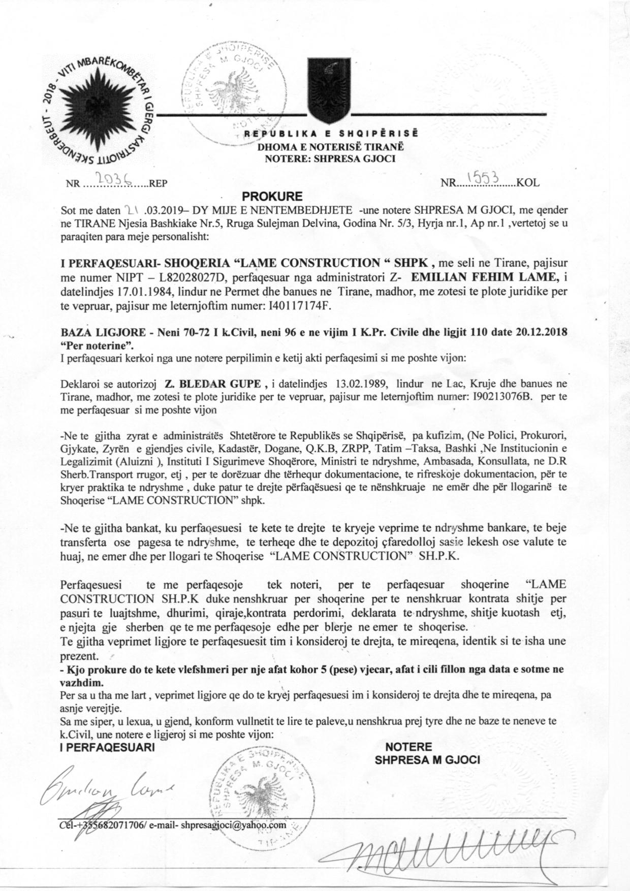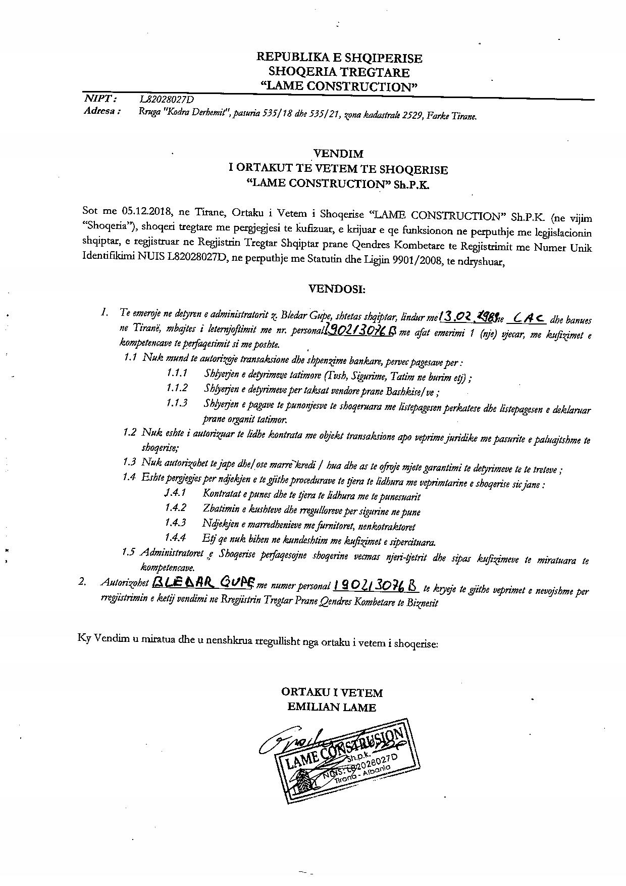 → Ekstrakti Historik i Regjistrit Tregtar date 17.11.2022 → Akt themelimi dhe Statuti i Shoqerise → Vendim i Ortakut te Vetem, Emerim Administratori/Kompetenca date 05.12.2018 → Prokure e Posacme date 21.03.2019 |