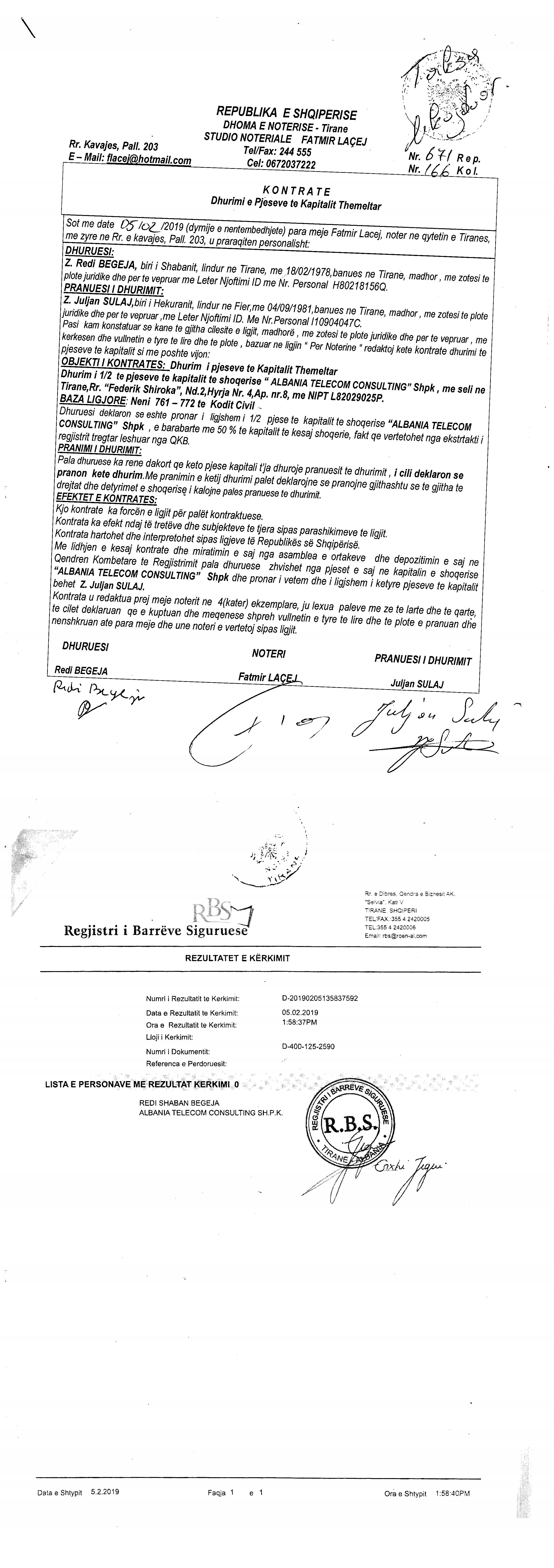 → Ekstrakti Historik i Regjistrit Tregtar date 17.11.2022 → Akt themelimi i Shoqerise → Kontrate Dhurimi Kuotash date 05.02.2019 |