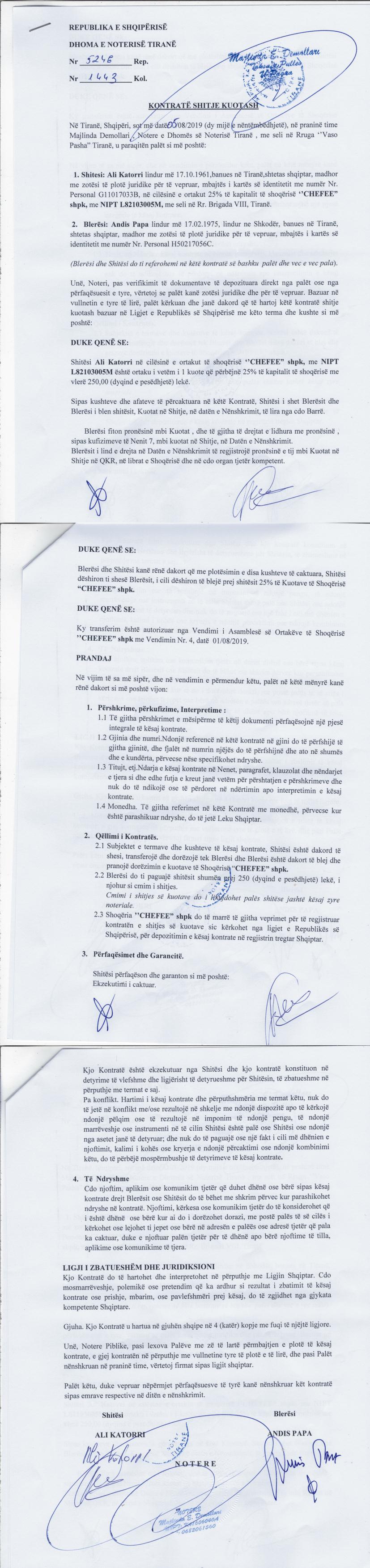 → Ekstrakti Historik i Regjistrit Tregtar date 18.11.2022 → Statuti i Shoqerise → Kontrate Shitje Kuotash date 11.06.2019 → Kontrate Shitje Kuotash date 05.08.2019 |