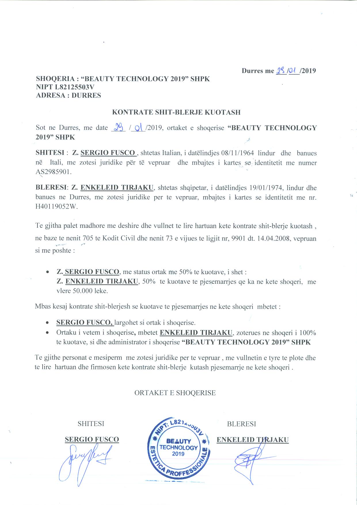 → Ekstrakti Historik i Regjistrit Tregtar date 05.12.2022 → Akt themelimi i Shoqerise → Kontrate Shitblerje Kuotash date 29.01.2019 |