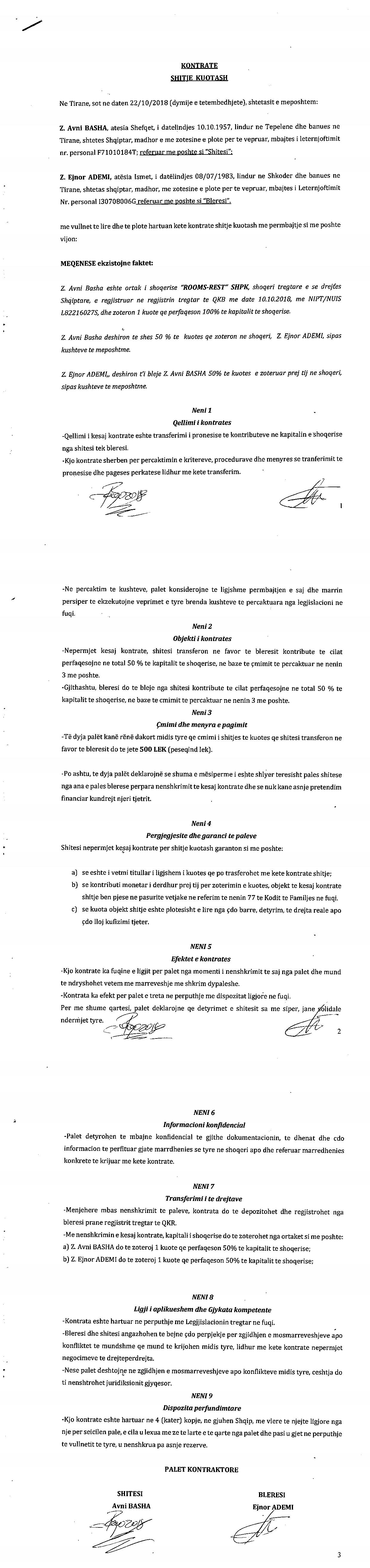 → Ekstrakti Historik i Regjistrit Tregtar date 12.12.2022 → Akt themelimi dhe Statuti i Shoqerise → Kontrate Shitje Kuotash date 22.10.2018 → Kontrate Shitblerje Kuotash date 23.05.2019 → Kontrate Shitje Kuotash date 08.03.2021 |