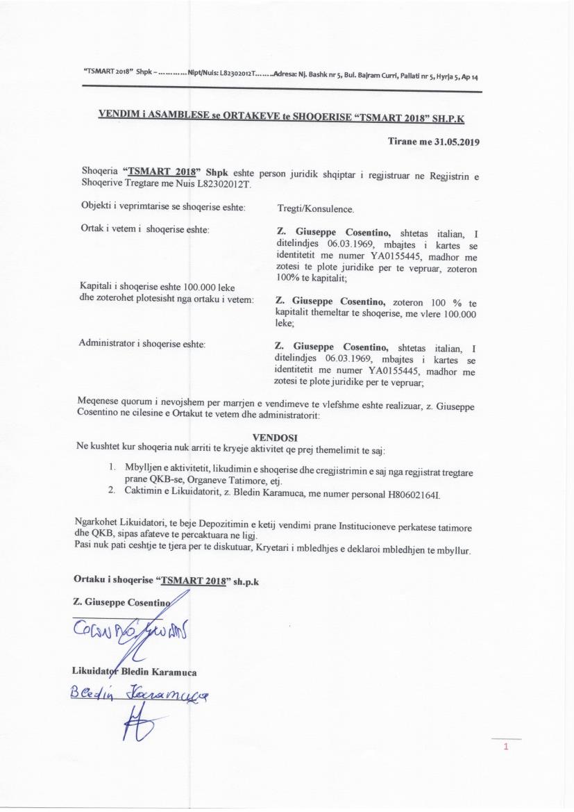 → Ekstrakti Historik i Regjistrit Tregtar date 15.12.2022 → Akt themelimi dhe Statuti i Shoqerise → Vendim i Ortakut te Vetem, Likuidim Shoqerie date 31.06.2019 → Vendim i Ortakut te Vetem, Cregjistrim Shoqerie date 30.09.2019 → Ekstrakti Historik i Regjistrit te Pronareve Perfitues date 15.12.2022 |