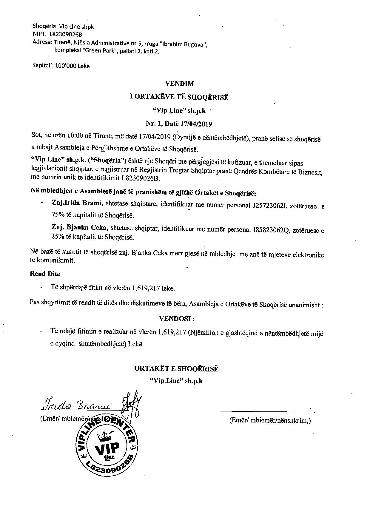 | Çështje Ligjore: | Me date 17.05.2019, me ane te Vendimit te Asamblese se Ortakeve, date 17.04.2019 u vendos te ndaje fitimin e realizuar ne vleren 1,619, 217 leke. |