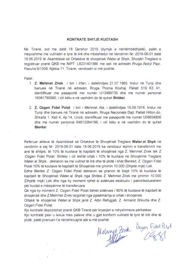 | Çështje Ligjore: | Me date 16.11.2020, me vendim te asamblese se ortakeve, ortaku Özgen Fidel Polat ndryshon te dhenat nga shtetas Turk ne nenshtetas Shqiptar. |