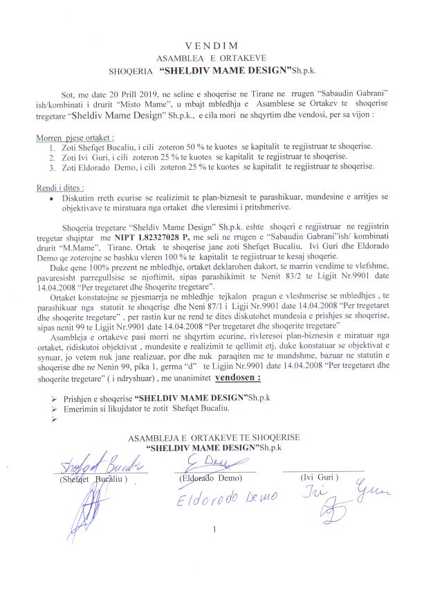 → Ekstrakti Historik i Regjistrit Tregtar date 21.12.2022 → Akt themelimi i Shoqerise → Vendim i Asamblese se Ortakeve, Likuidim Shoqerie date 20.04.2019 |