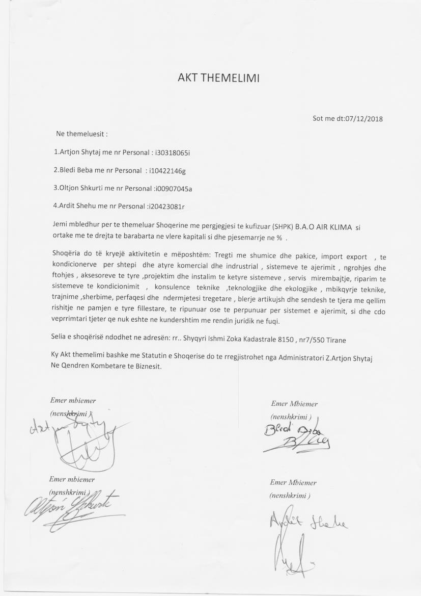 → Ekstrakti Historik i Regjistrit Tregtar date 23.12.2022 → Akt themelimi i Shoqerise → Kontrate Shitblerje Kuotash date 23.01.2020 → Kontrate Shitblerje Kuotash date 28.01.2022 |