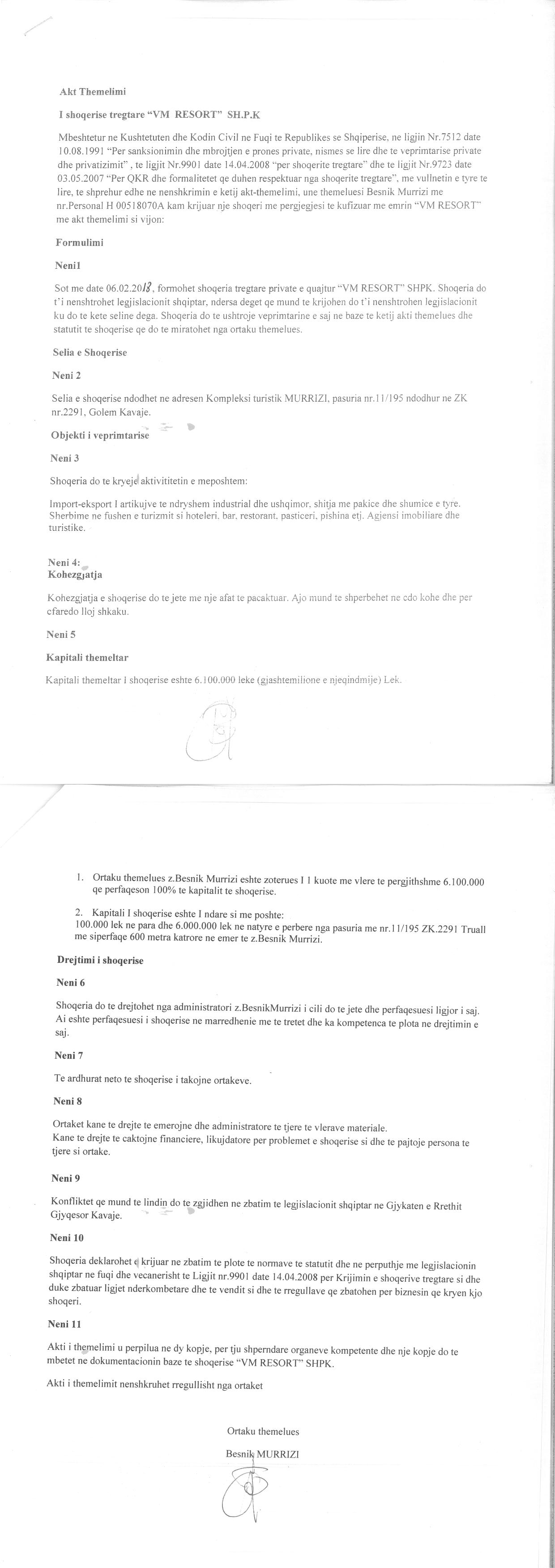 → Ekstrakti Historik I Regjistrit Tregtar date 19.10.2020 → Akti i themelimit te Shoqerise → Ekstrakt Historik i Regjistrit Tregtar date 19.02.2024 → Urdhër për Vënien e Sekuestros datë 18.08.2022 → Urdhër për Heqjen e Sekuestros datë 06.10.2022 |