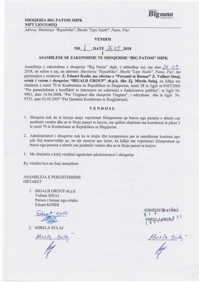 ketyre. II. Me date 20/11/2019, me ane te Vendimit të Asamblesë se Ortakeve dt.11.11.2019, u vendos, Pas nenit 9 të statutit të shoqerise të shtohet neni 9/1 me përmbajtje : Ortaket BIGALB GROUP dhe zj. Mirela Sulaj vetem përsa i përket fitimit, do të përfitojnë nga 50% secili te fitimit te deklaruar nga shoqeria ne pasqyrat financiare dhe te drejtat e përfitimit te dividentit nuk jane te transferueshme tek te tretët pa pëlqimin e te gjithë ortakëve të shoqërisë. |
