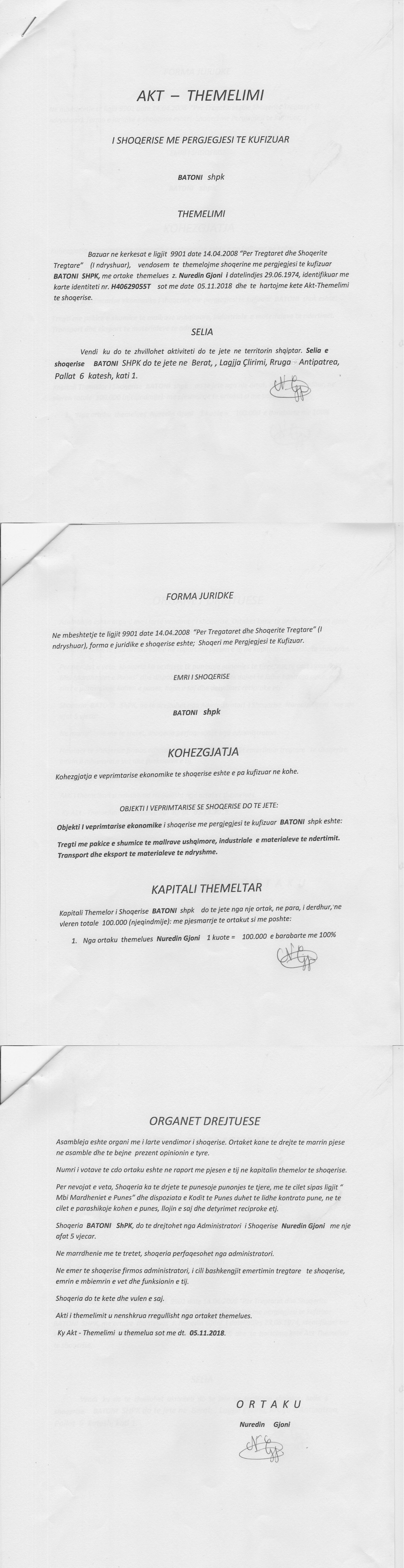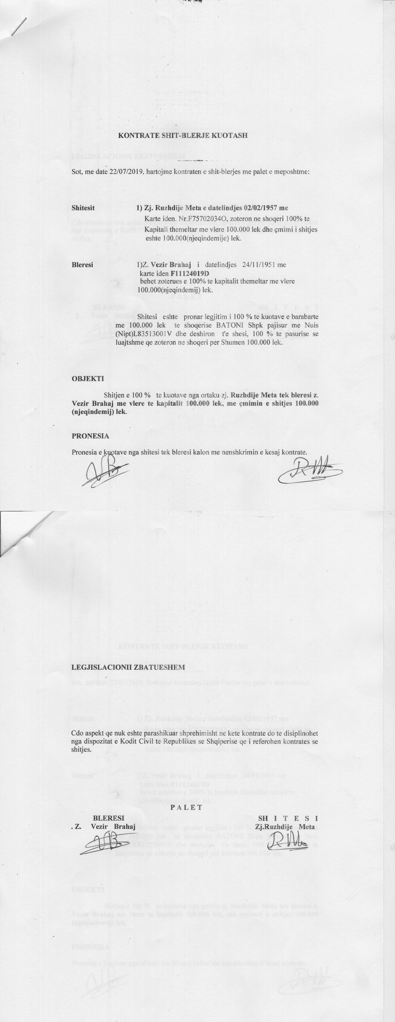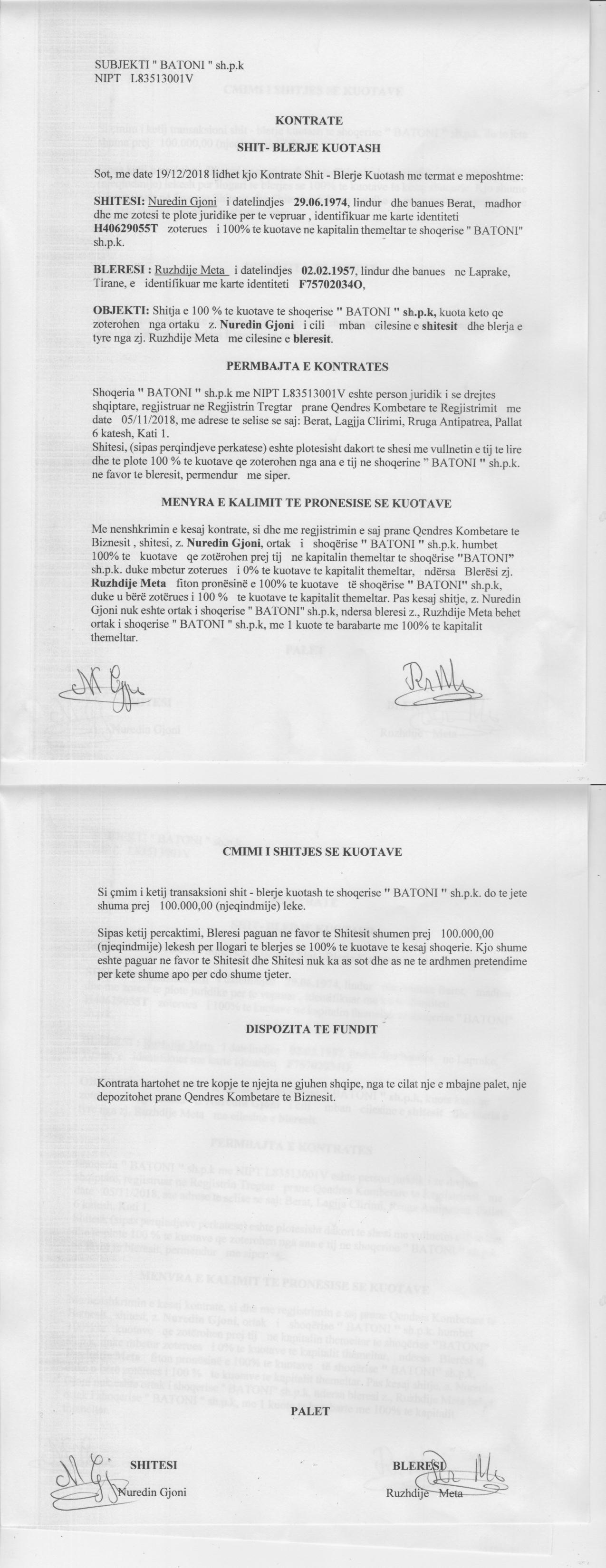 → Ekstrakti Historik i Regjistrit Tregtar date 19.12.2022 → Akt themelimi i Shoqerise → Kontrate Shitblerje Kuotash date 19.12.2018 → Kontrate Shitblerje Kuotash date 22.07.2019 |