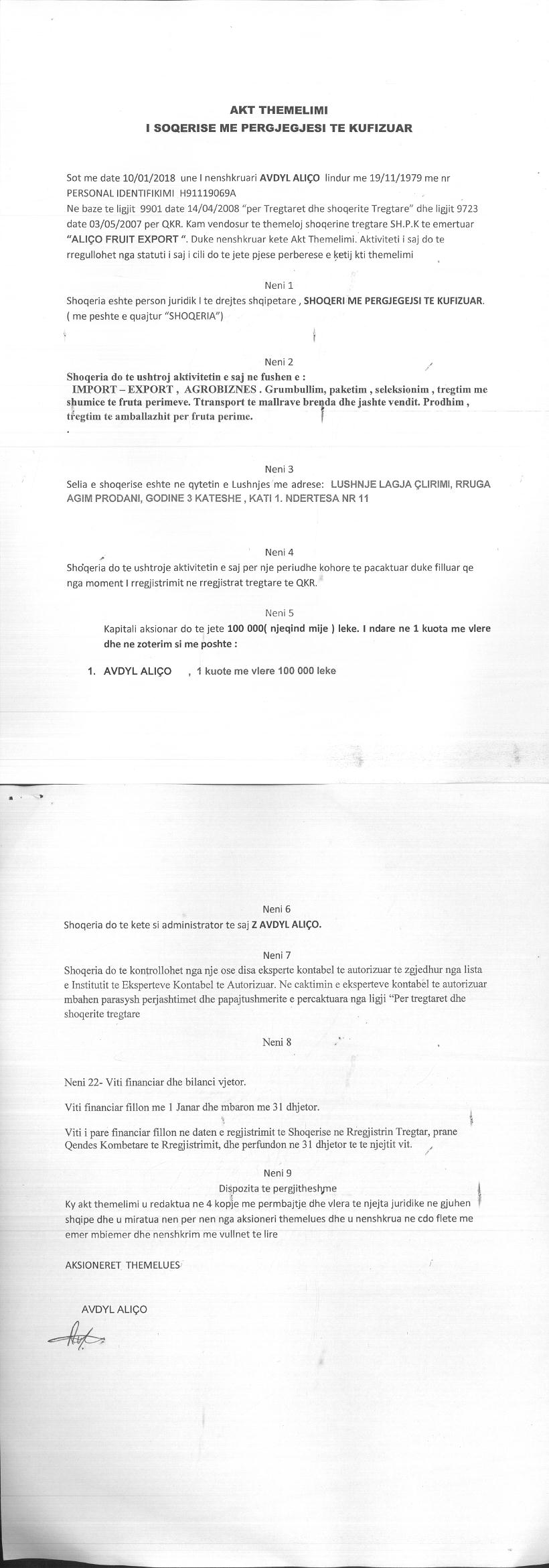 | Çështje Ligjore: | Sipas vendimit te asamblese se pergjithshme date 07.03.2018, eshte ndryshuar statusi i shoqerise nga aktiv ne te pezulluar. |
