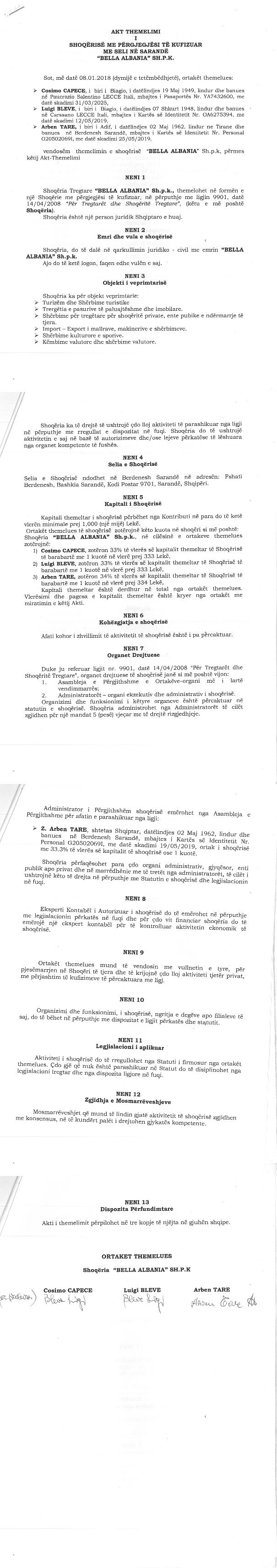 | Objekti i Veprimtarisë: | Turizem dhe Sherbime turistike. Tregtia e pasurive te paluajteshme dhe imobilare. Sherbime per tregtare per shoqerite private, ente publike e ndermarrje te tjera. ImportExport i mallrave, makinerive e sherbimeve. Sherbime kulturore e sportive. Kembime valutore dhe sherbime valutore. Shoqeria ka te drejte te ushtroje çdo lloj aktiviteti te parashikuar nga ligji ne perputhje me rregullat e dispozitat ne fuqi. Shoqeria do te ushtroje aktivitetin e saj ne baze te autorizimeve dhe ose lejeve perkatese te leshuara nga organet kompetente te fushes. |