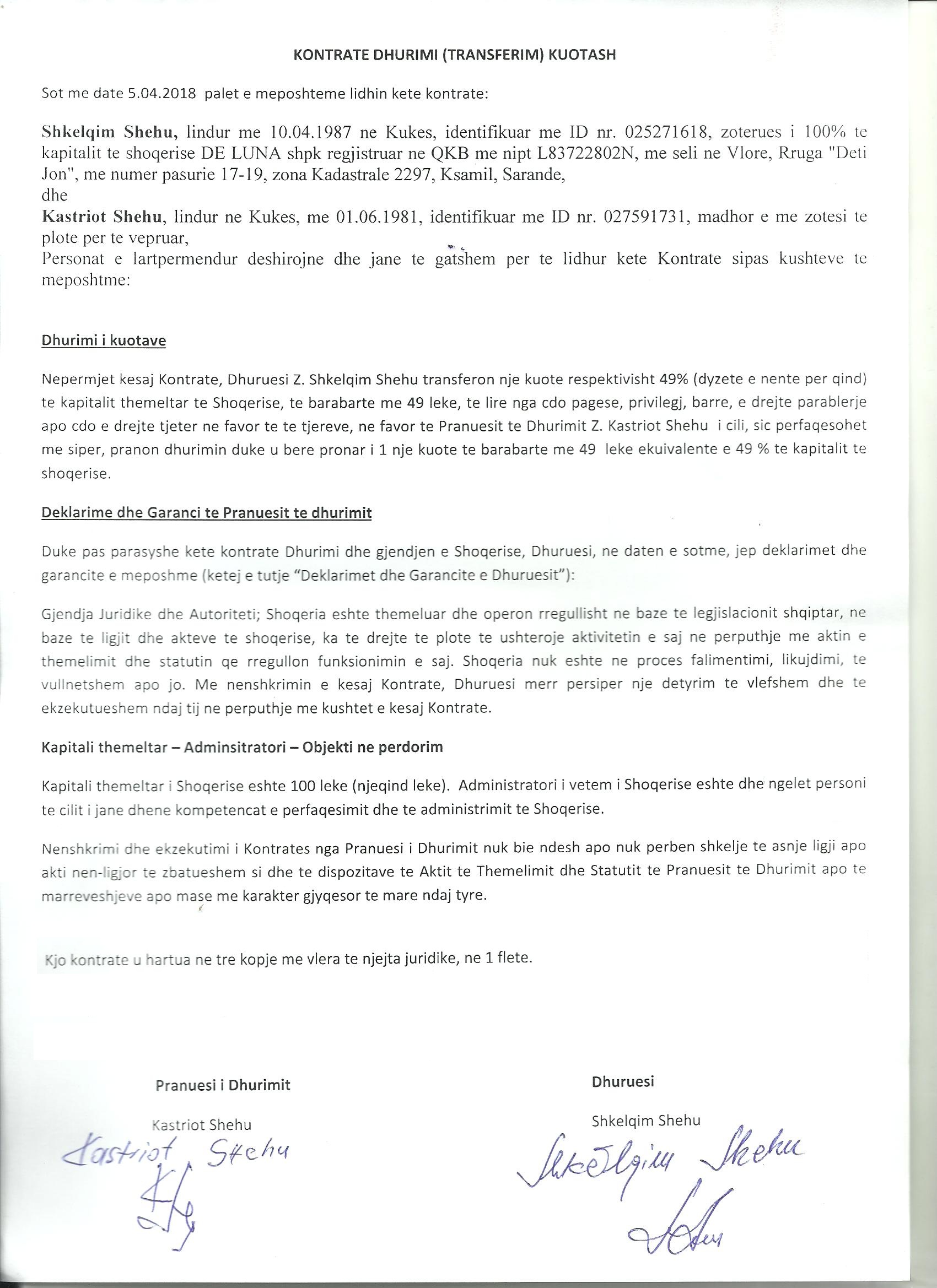 → Ekstrakt Historik i Regjistrit Tregtar date 26.08.2022 → Akt themelimi dhe Statuti i Shoqerise → Kontrate Dhurimi Kuotash date 05.04.2018 |