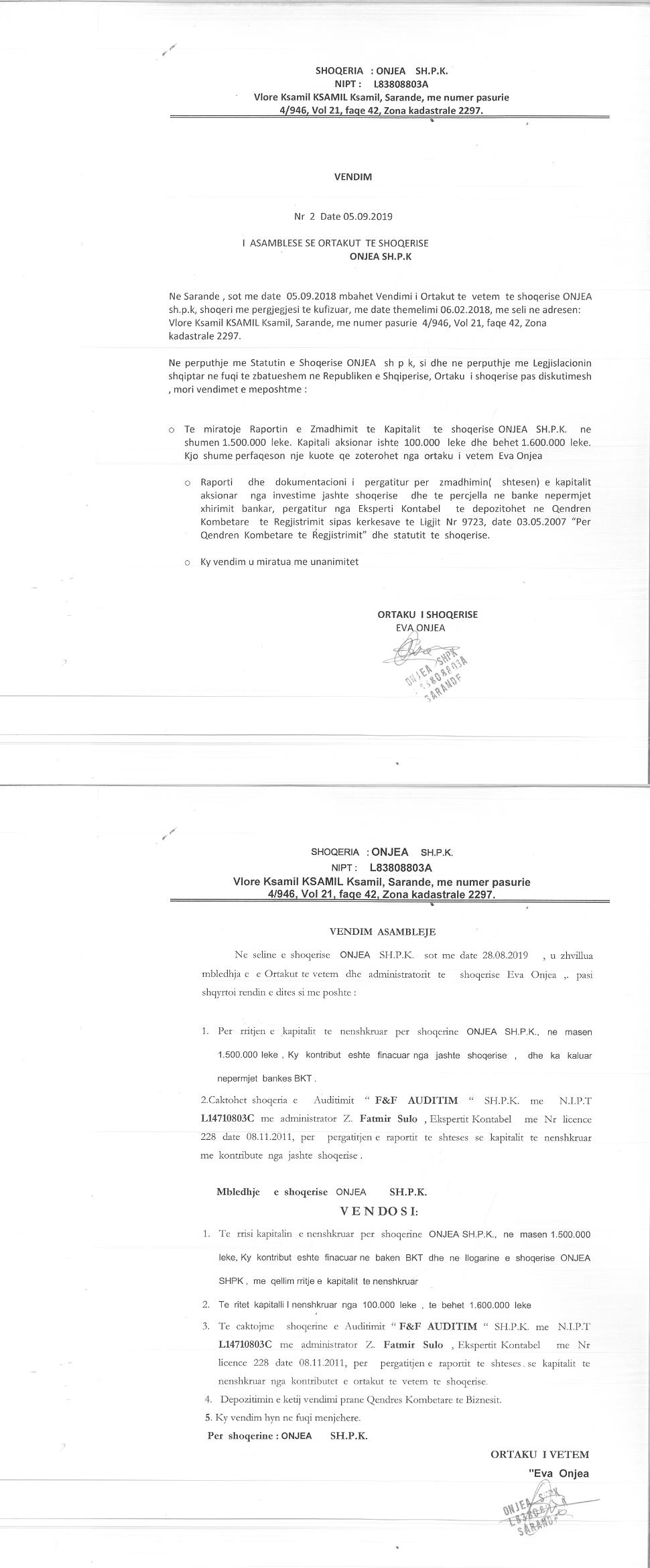 → Ekstrakt Historik i Regjistrit Tregtar date 30.08.2022 → Akt themelimi i Shoqerise → Vendim i Ortakut te Vetem, Zmadhim Kapitali date 05.09.2019 → Prokure e Posacme date 17.12.2019 → Vendim i Ortakut te Vetem, Zmadhim Kapitali date 18.03.2022 |