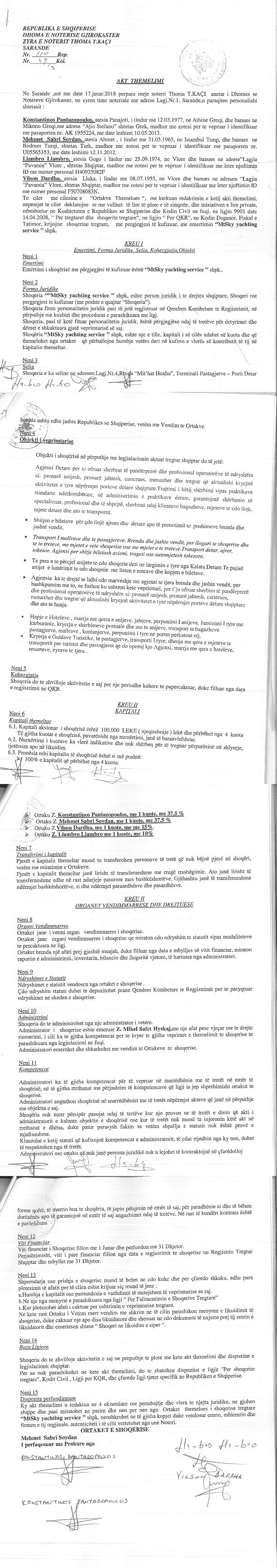 | Objekti i Veprimtarisë: | Agjensi detare per te ofruar sherbim te panderprere dhe professional operatoreve te ndryshem si: pronare anijesh, pronare jahtesh, carterues, menaxher dhe tregetar qe aktualisht kryejne aktivitetet e tyre nepermjet porteve detare shqiptare. Trajnimi I ketij sherbimi sipas praktikave standarte nderkombetare, ne administrimin e praktikave detare, garantojme sherbimin te specializuar, professional dhe te shpejte, sherbim ndaj klienteve e bagazheve, mjeteve te cdo lloji, mjete detare dhe ato te transportit. Shitjen e biletave per cdo lloj linje ajrore dhe detare apo te prenotimit te pushimeve Brenda dhe jashte vendit. Transport I mallrave dhe pasagjereve Brenda dhe jashte vendit, per llogari te shoqerise dhe te te treteve, me mjetet e vete shoqerise ose me mjetet e te te treteve. Transport detar, ajror, tokesor. Agjensi per shitje biletash avionic, trageti ose autojmetesh tokesore. Te pres e te percjell anije te cdo shoqerie deri ne largimin e tyre nga Kalata detare. Te pajise anijet e lundrimit te cdo shoqerie me listen e emrave dhe kopjen e biletave. Agjensia ka te drejte te lidhi cdo marrveshje me agjensi te tjera Brenda dhe jashte vendit per bashkepunim me to ne fushen ku ushtron kete veprimtari per tju ofruar sherbim te panderprere dhe professional operatoreve te ndryshem si : pronare anijesh, carterues, menaxher dhe tregetar qe aktualisht kryejne aktivitetet e tyre nepermjet porteve detare shqiptare dhe ato te huaja. Hapje e Hoteleve, marrja me qera e anijeve e jahteve, perpunimi I anijeve, furnizimi I tyre me karburante, kryerja e sherbimeve portuale dhe ato te anijeve, transport te bagazheve, pasagjereve, mallrave, kontanjerve, perpunimi I tyre ne portet perkatese. Kryerja e guidave turistike, te pasagjerve, transporti I tyre, dhenia me qera e mjeteve te transportit per turistet dhe pasagjereve qe do operoj kjo agjensi, marrja me qera e hoteleve, resorteve, zurave te tjera. |