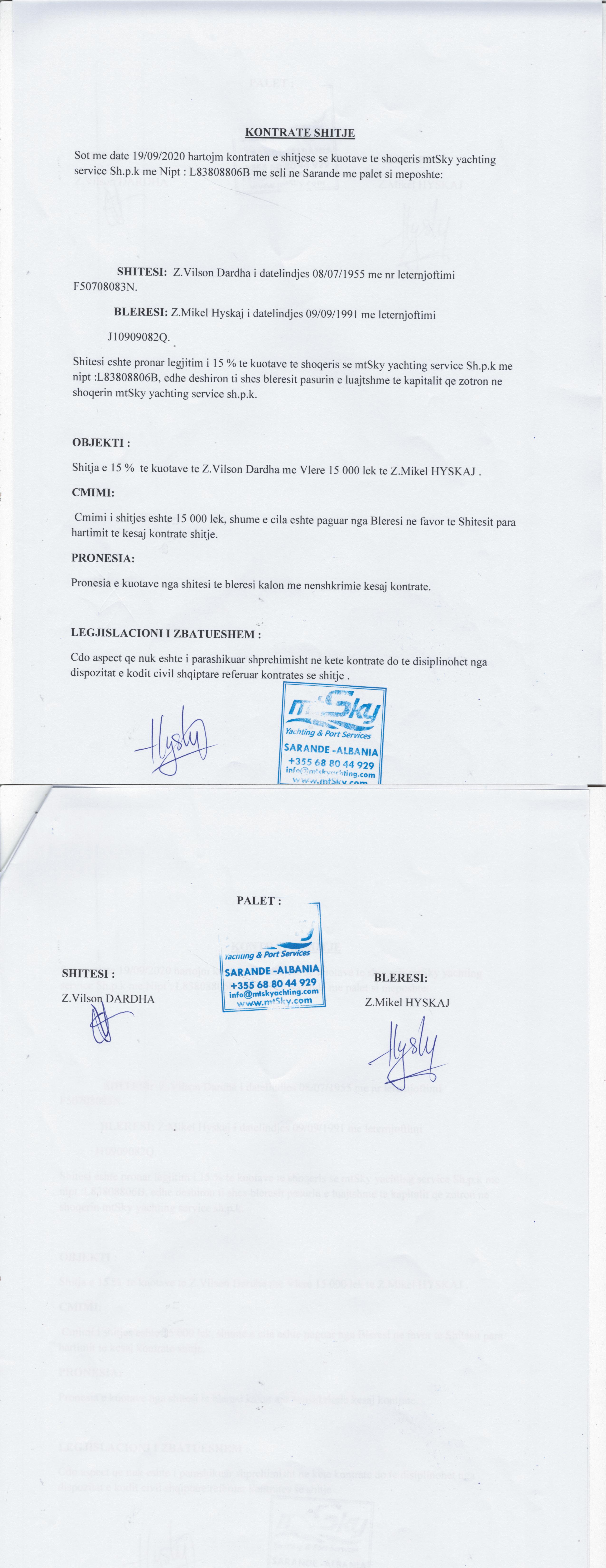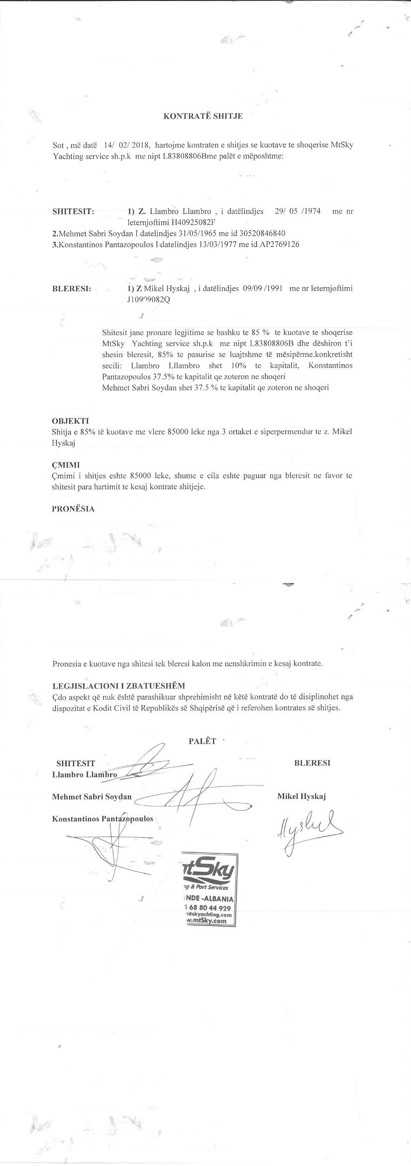 → Ekstrakt Historik i Regjistrit Tregtar date 30.08.2022 → Akt themelimi i Shoqerise → Kontrate Shitje Kuotash date 14.02.2019 → Kontrate Shitje Kuotash date 19.09.2020 |