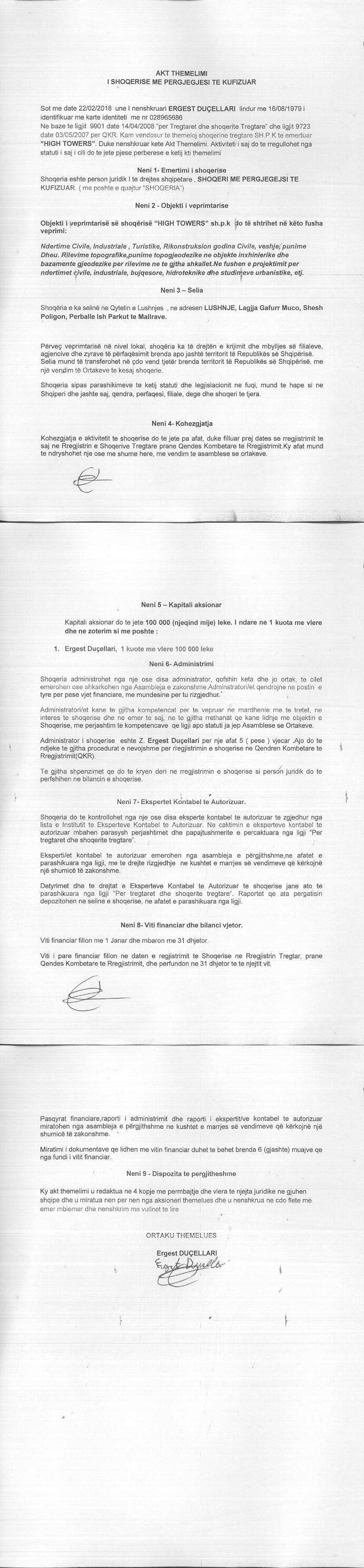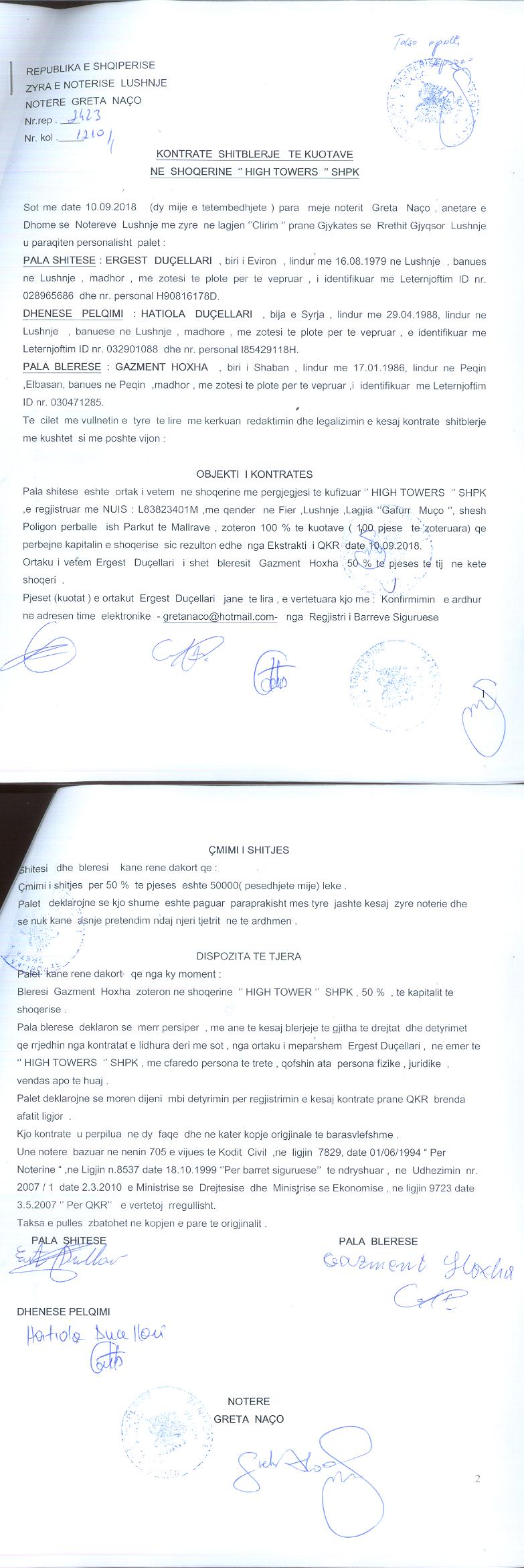 → Ekstrakt Historik i Regjistrit Tregtar date 02.09.2022 → Akt themelimi i Shoqerise → Kontrate Shitblerje Kuotash date 10.09.2018 |