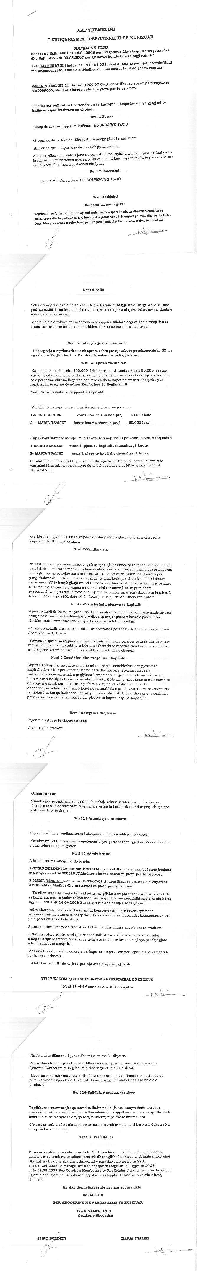 | Çështje Ligjore: | Me date 11.09.2018, me vendim te asamblese se ortakeve, u vendos : Pushimi i Përkohshëm i Aktivitetit. Statusi i Shoqerise kalon nga "Aktiv" ne "Pezulluar" |