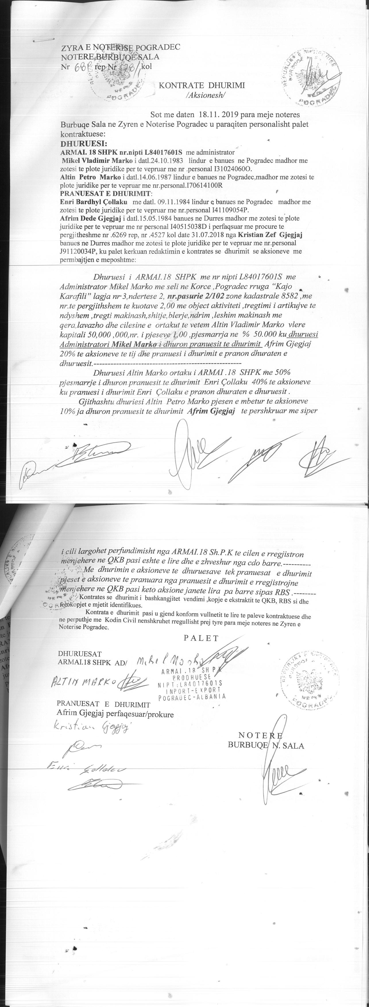 → Ekstrakti Historik i Regjistrit Tregtar date 08.10.2022 → Statuti i Shoqerise → Kontrate Dhurimi Kuotash, date 18.11.2019 → Vendim i Asamblese se Ortakeve, Zmadhim Kapitali, date 03.09.2021 → Vendim i Asamblese se Ortakeve, Zmadhim Kapitali, date 24.04.2022 |
