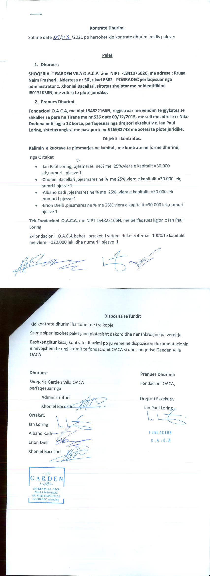 | Shoqëri Mëmë / Zotërues për këtë Subjekt: | Fondacioni O.A.C.A, me nipt L54822166N, regjistruar me Vendim te Gjykates se Shkalles se Pare ne Tirane me date 09.12.2015, me seli ne Korce, rr. Niko Dodona nr.6 lagjia 12, perfaqesuar nga drejtori ekzekutiv Ian Paul Loring. Sipas Kontrates se Dhurimit te Kuotave, date 05.03.2021 Sipas Ekstraktit Historik te Regjistrit te Pronarit Perfitues, date 22.09.2022, terhequr nga QKB date 13.10.2022, nuk jane identifikuar pronaret perfitues te subjektit. |