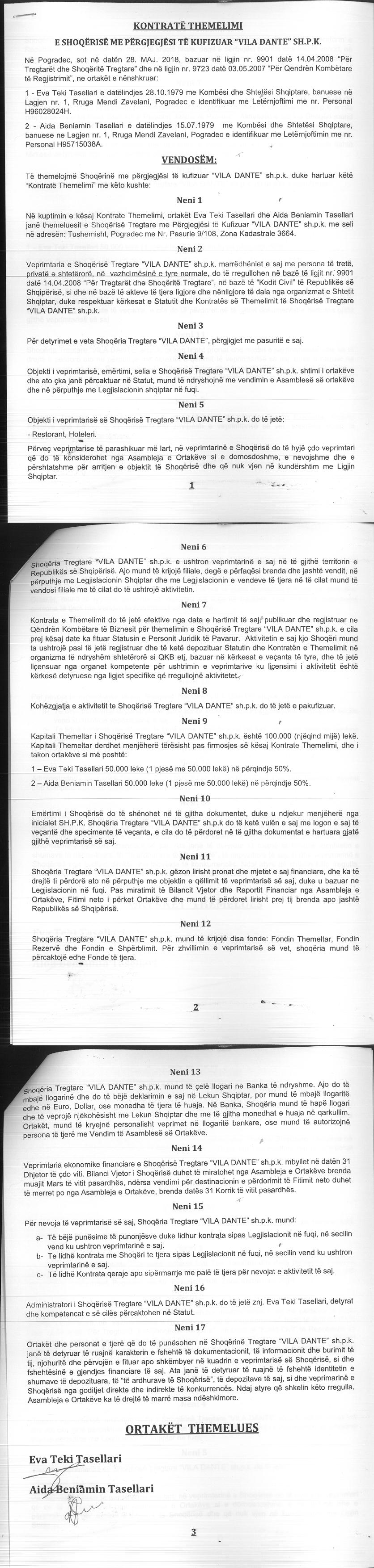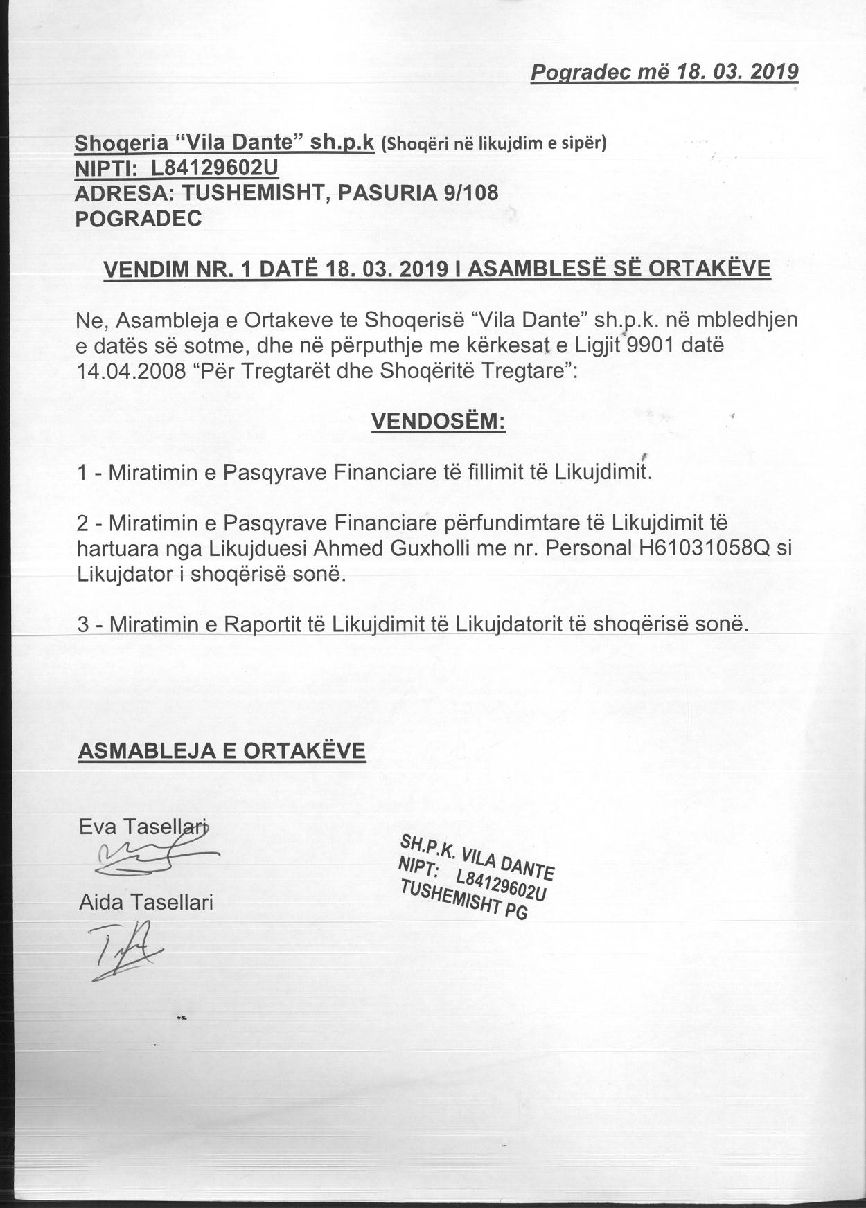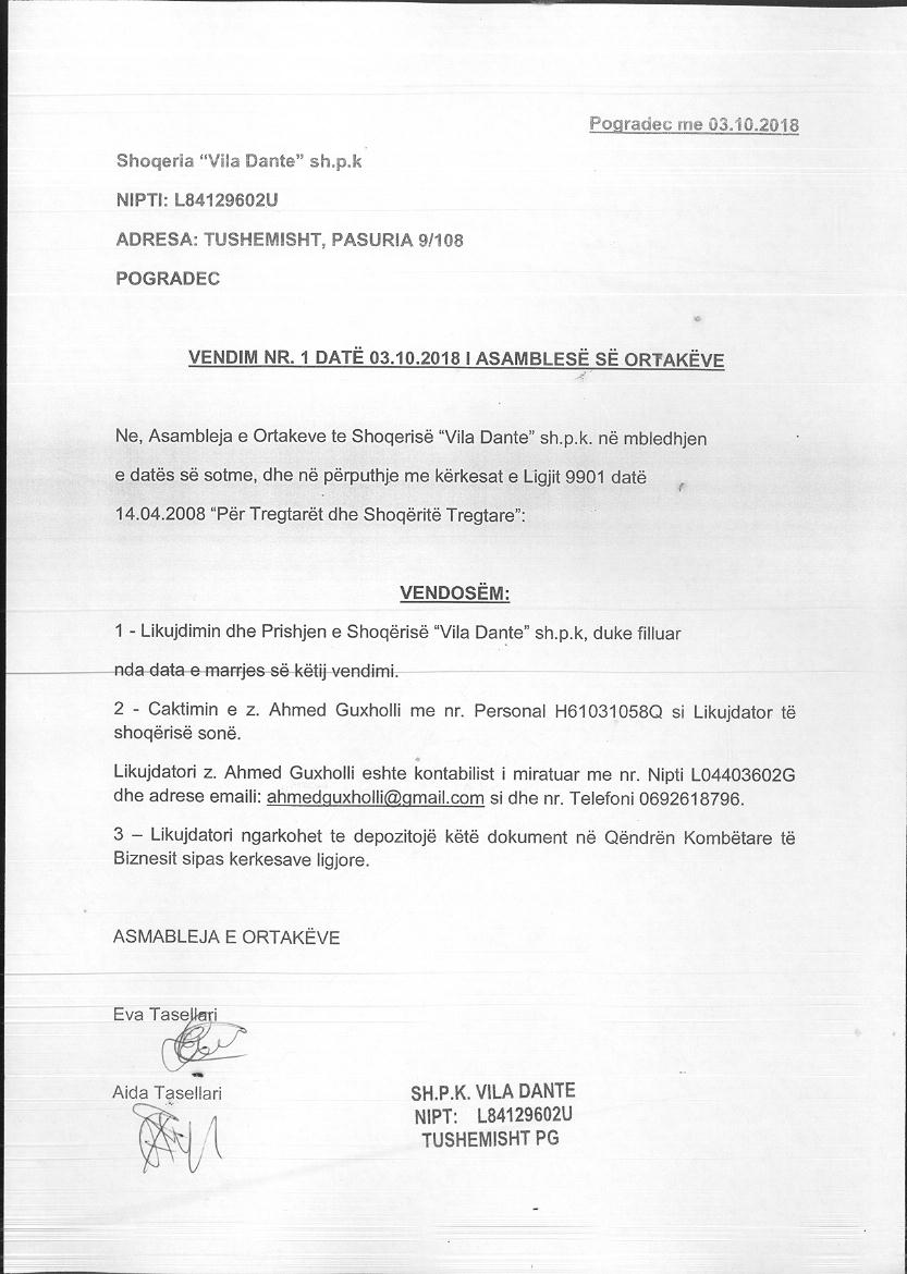 → Ekstrakt Historik i Regjistrit Tregtar date 21.10.2022 → Akt themelimi i Shoqerise → Vendim i Asamblese se Ortakeve, Likudim Shoqerie date 03.10.2018 → Vendim i Asamblese se Ortakeve, Cregjistrim Shoqerie date 18.03.2019 |