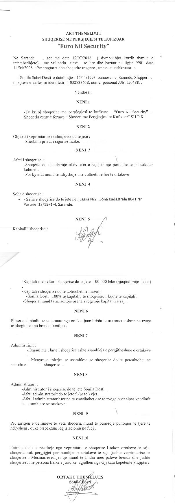 | Objekti i Veprimtarisë: | Sherbim privat i sigurise fizike |
