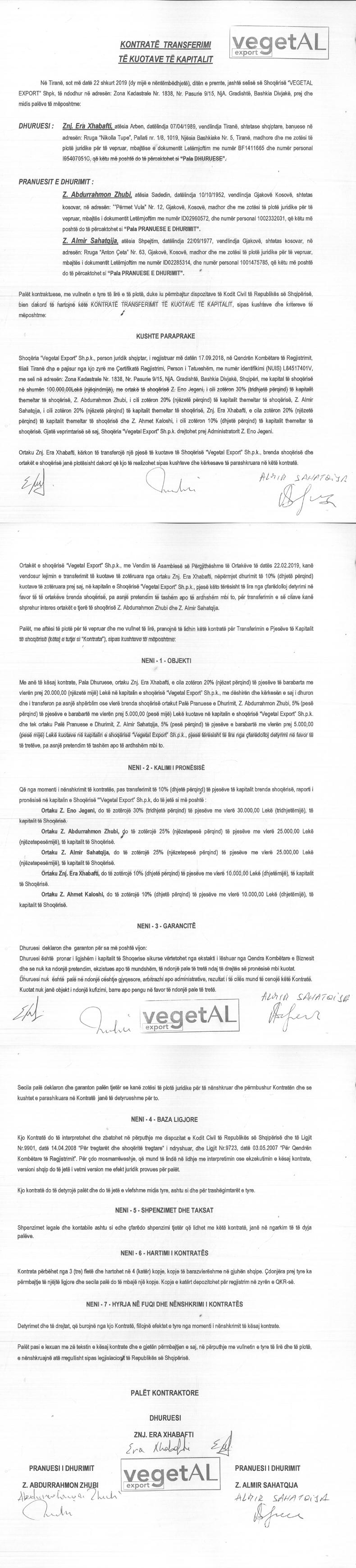 → Ekstrakti Historik i Regjistrit Tregtar date 01.12.2022 → Akt themelimi i Shoqerise → Kontrate Dhurimi Kuotash date 22.02.2019 → Kontrate Shitje Kuotash date 13.01.2020 → Kontrate Dhurimi Kuotash date 05.08.2020 → Ekstrakti Historik i Regjistrit te Pronareve Perfitues date 01.12.2022 → Ekstrakt Historik i Regjistrit Tregtar date 17.04.2024 → Të dhënat e Investimit, Financimet Nga IPARD - Aksesuar nga Agjencia për Zhvillim Bujqësor dhe Rural AZHBR datë 17.04.2024 |