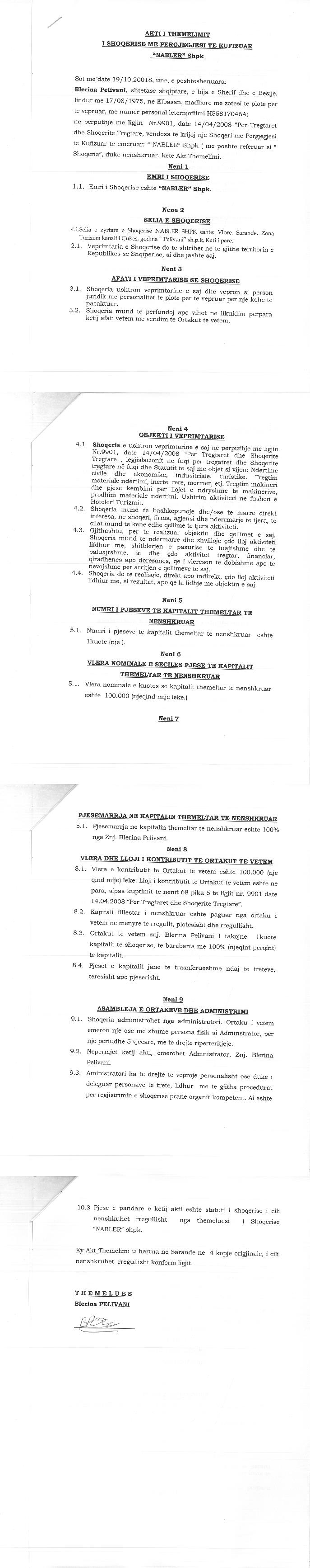 | Objekti i Veprimtarisë: | Ndertimi civile dhe ekonomike, industriale , turistike. Tregtim materiale ndertimi , inerte, rere, mermer etj. Tregtim makineri dhe pjese kembimi per llojet e ndryshme te makinerive , prodhim materiale ndertimi. Ushtrim ne aktivitetin e Hoteleri-Turizem. Shoqeria mund te bashkepunoje dhe / ose te marre direkt interesa ne shoqeri , firma, agjensi dhe ndermarrje te tjera te cilat mund te kene edhe qellime te tjera aktiviteti. Gjithashtu per te realizura objektin dhe qellimet e saj. Shoqeria mund te ndermarre dhe te zhvilloje cdo lloj aktiviteti lidhur me shitblejen e pasurise se luajtshme dhe te paluajtshme si dhe cdo aktivitet tregtar, financiar, qiradhenes apo dorezanes qe i vlerson te dobishme apo te nevojshme per arritjen e qellimeve te saj. Shoqeria do te realizoje direkt apo indirekt cdo lloj aktiviteti lidhur me si rezultat apo qe ka lidhje me objektin e saj. |