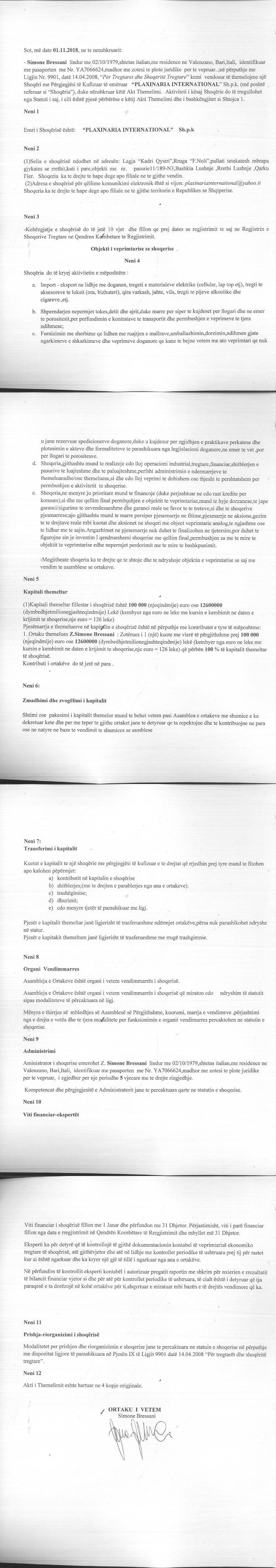 | Shënime: | Kapitali i shoqerise eshte i shprehur ne euro ( ne shumen 100.000 euro), por eshte konvertuar ne leke sipas kursit te kembimit date 01.11.2018 (126) |