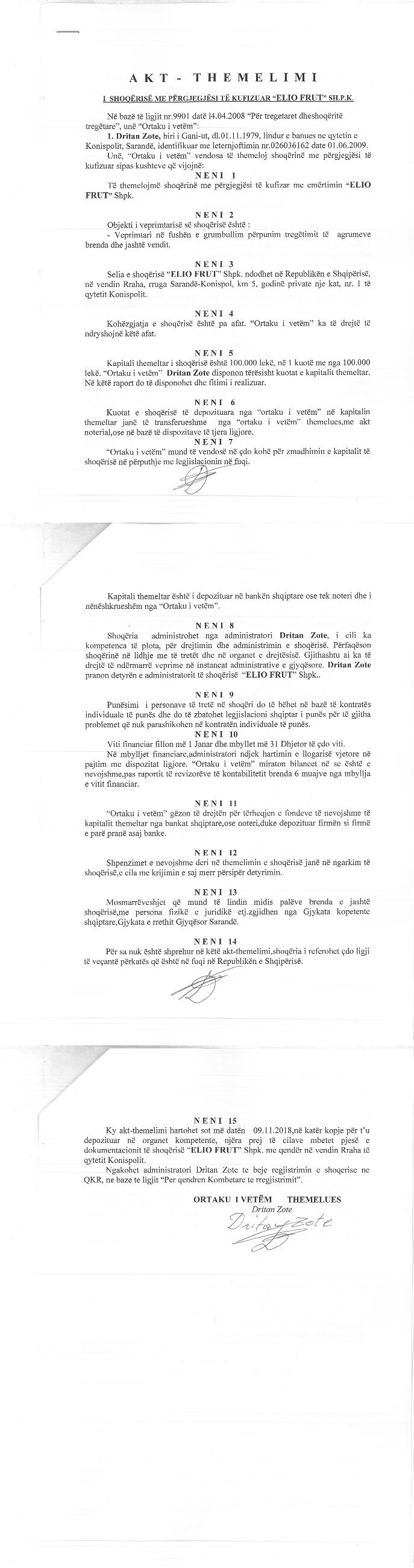 | Objekti i Veprimtarisë: | Veprimtari ne fushen e grumbullim perpunim tregetimit te agrumeve brenda dhe jashte vendit |