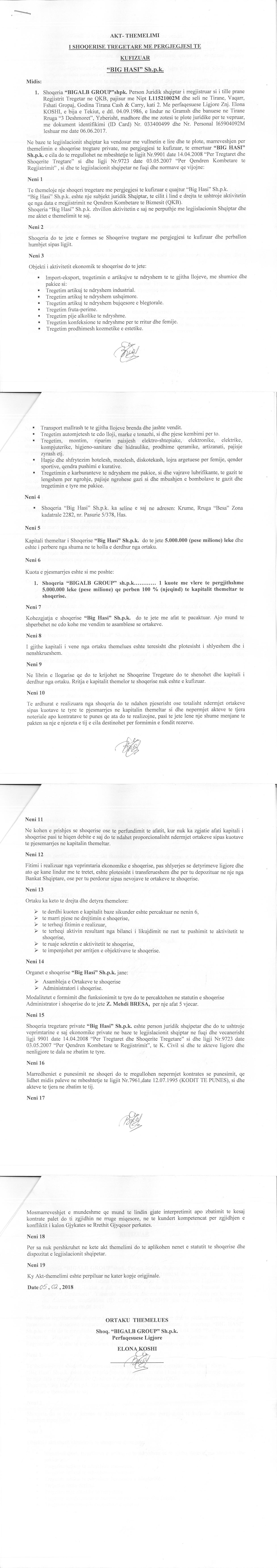 → Ekstrakti Historik I Regjistrit Tregtar date 24.11.2020 → Akti i themelimit te Shoqerise → Ekstrakt Historik i Regjistrit Tregtar date 14.08.2024 → Vendim Nr. 1 i Asamblesë së Zakonshme, për moskryerjen e Veprimtarive Fitimprurëse që buron nga Pasuria e Shtetit ose Pushteti Vendor datë 01.03.2018 → Ekstrakt Historik i Regjistrit te Pronareve Perfitues date 14.08.2024 |