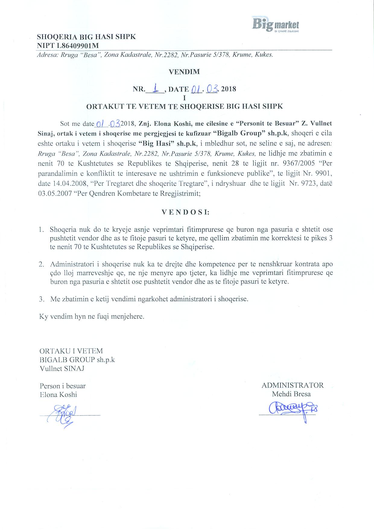 | Shënime: | Kompetencat e Administratorit: Shoqëria nuk do të kryejë asnjë veprimtari fitimprurëse që buron nga pasuria e shtetit ose pushteti vendor dhe as të fitojnë pasuri të këtyre me qëllim zbatimin me korrektësi të pikës 3 të nenit 70 të Kushtetutës së Republikës së Shqipërisë. Administratori i Shoqërisë nuk ka të drejtë dhe kompetencë për të nënshkruar kontrata apo çdo lloj marrëveshje që në një mënyrë apo tjetër, ka lidhje me veprimtari fitimprurëse që buron nga pasuria e shtetit ose pushtetit vendor dhe as të fitojnë pasuri të këtyre. |