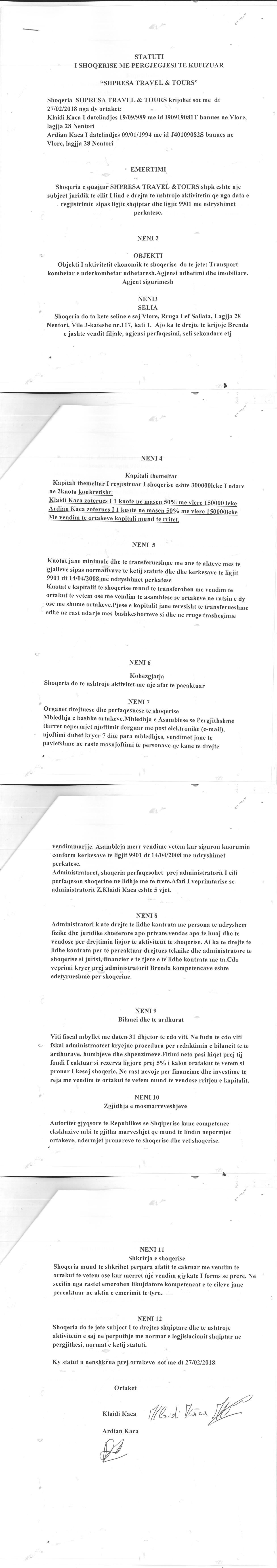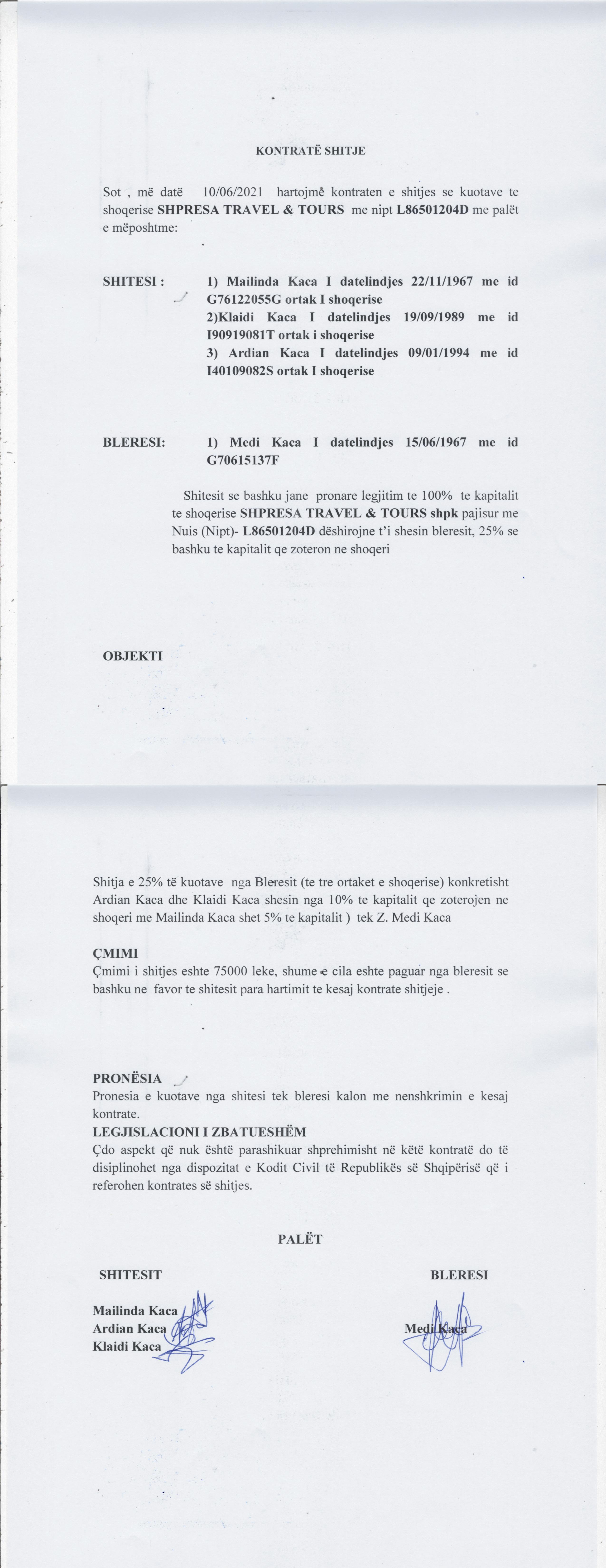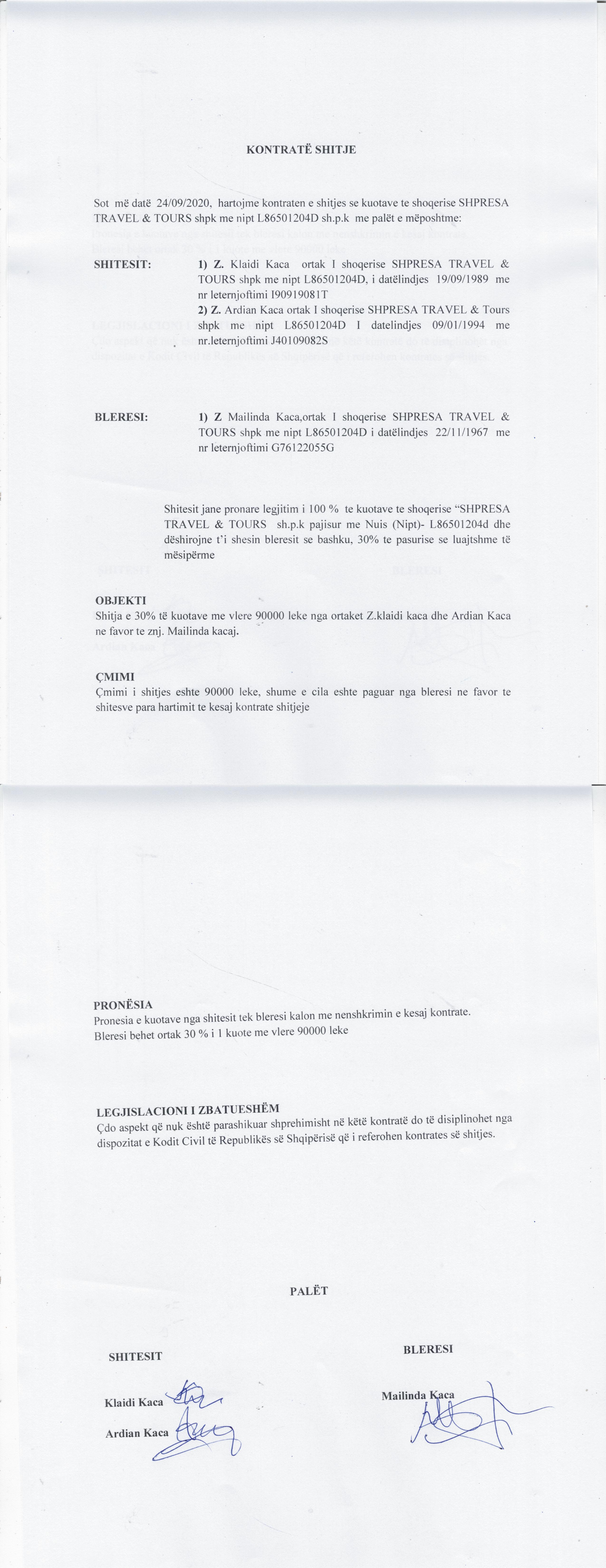 → Ekstrakt Historik i Regjistrit Tregtar date 09.09.2022 → Statuti i Shoqerise → Kontrate Shitje Kuotash date 24.09.2020 → Kontrate Shitje Kuotash date 10.06.2021 |