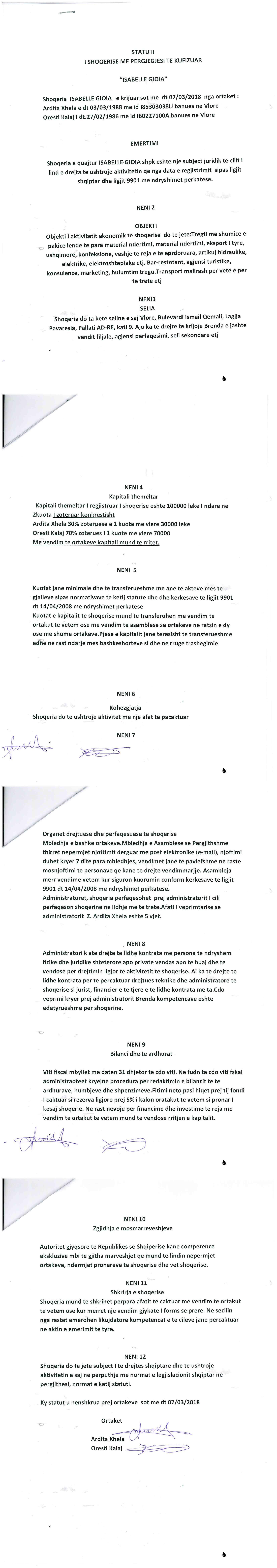 | Çështje Ligjore: | I. Me date 02.04.2019, me vendim te asamblese se ortakeve, u vendos : Pushim i Perkohshem i Aktivitetit. Statusi i Shoqerise kalon nga "Aktiv" ne "Pezulluar" II. Me date 03/02/2022, me ane te Urdhrit Nr.578 Prot., Nr.1784 dosje, datë 28.01.2022, lëshuar nga Zyra e Përmbarimit Privat “AA Bailiff” SHPK, protokolluar nga QKB me Nr. 3133 Prot datë 01.02.2022, u urdherua vendosja e sekuestros mbi kuotat që zotëron debitori Oresti Kalaj në subjektin “ISABELLE GIOIA” SHPK me NUIS (NIPT) - L86516204J, duke ndaluar disponimin ose tjetërsimin e tyre, si dhe ushtrimin e të drejtave që rrjedhin nga këto kuota”. |