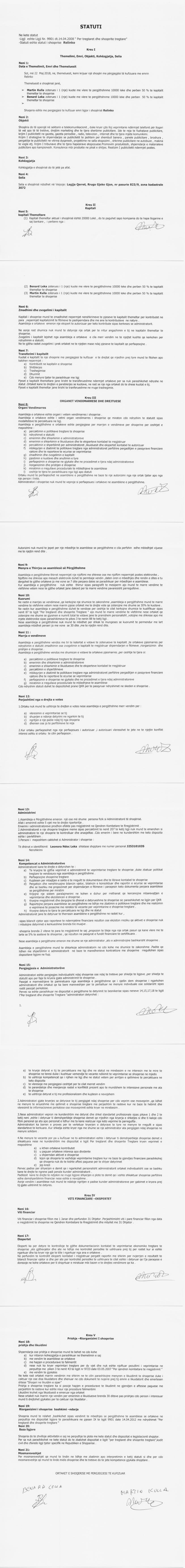→ Ekstrakt Historik i Regjistrit Tregtar date 20.10.2022 → Statuti i Shoqerise → Kontrate Shitje Kuotash date 04.02.2020 |