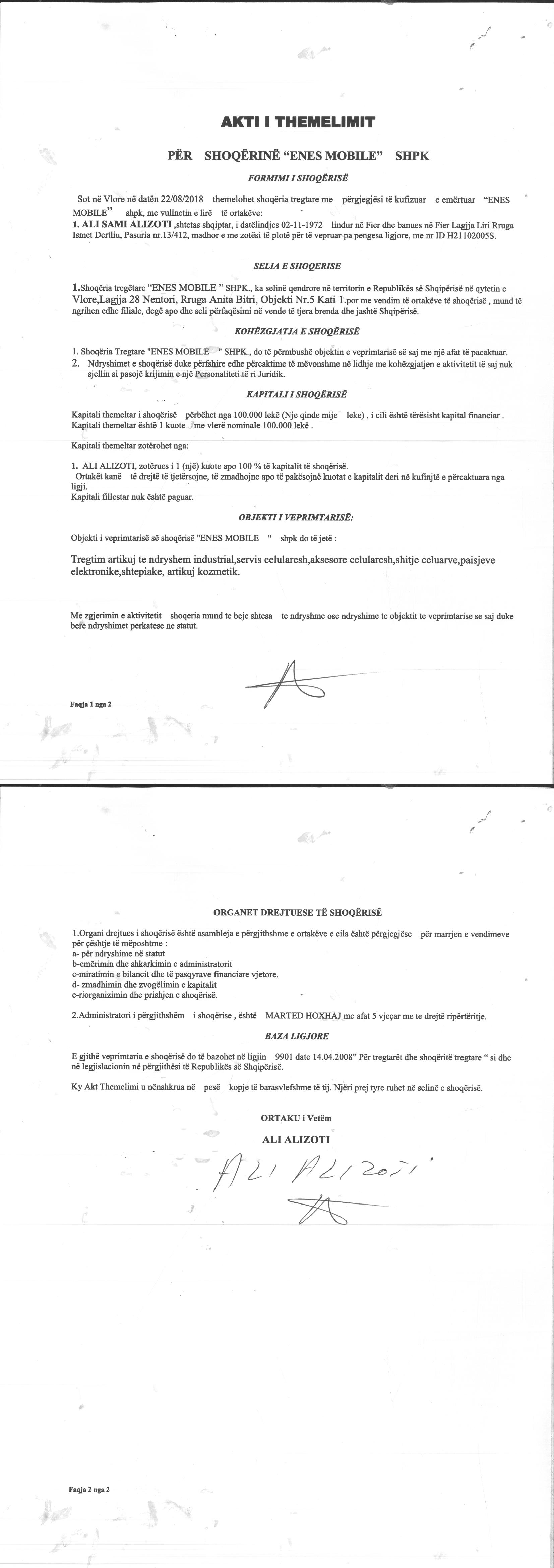 | Objekti i Veprimtarisë: | Tregtim artikuj te ndryshem industrial,servis celularesh,aksesore celularesh,shitje celulareve,pajisjeve elektronike,shtepiake,artikuj kozmetik. |