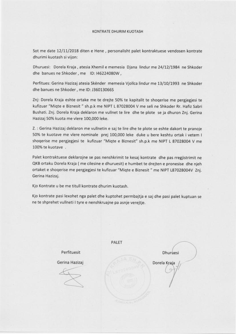 → Ekstrakti Historik i Regjistrit Tregtar date 17.11.2022 → Statuti i Shoqerise → Kontrate Dhurimi Kuotash date 12.11.2018 → Vendim i Ortakut te Vetem, Zmadhim Kapitali date 11.05.2022 |