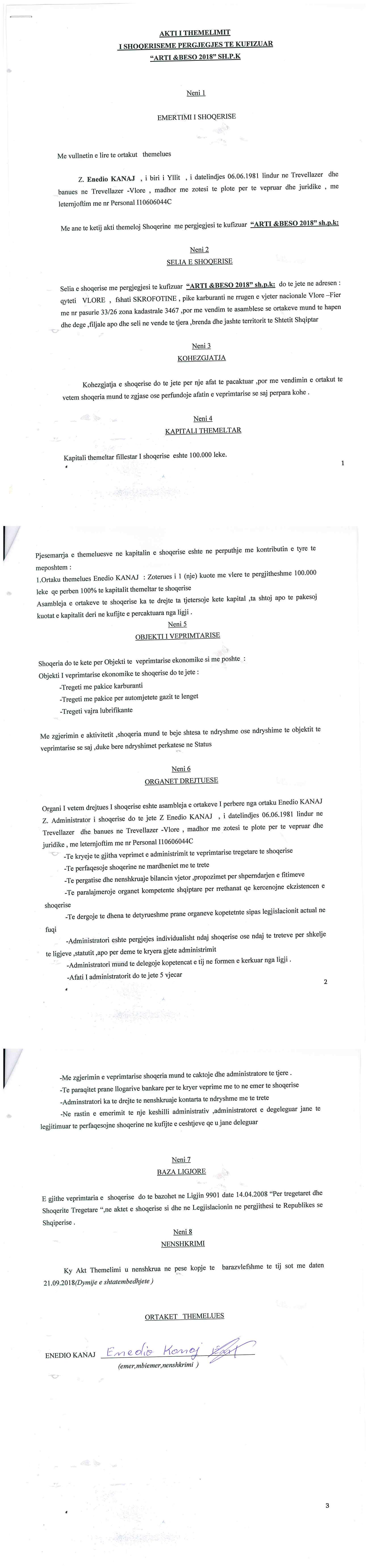 | Çështje Ligjore: | I. Me date 05.07.2022, me kerkese te administratorit te shoqerise, u kerkua: Pushim i Përkohshëm i Aktivitetit. Statusi i Shoqerise kalon nga "Aktiv" ne "Pezulluar" II. Me date 10/10/2022, me ane te Kërkesës Nr. 9427 Prot., datë 19.08.2022, “Kërkesë për vendosjen e Barrës Siguruese mbi titujt e pronësisë”, ardhur nga Drejtoria e të Ardhurave Vendore, Bashkia Vlorë, u kerkua Vendosja e Barrës Siguruese mbi titujt e pronësisë së tatimpaguesit “ARTI & BESO 2018” shpk, pajisur me NUIS (NIPT) L87124203I. |