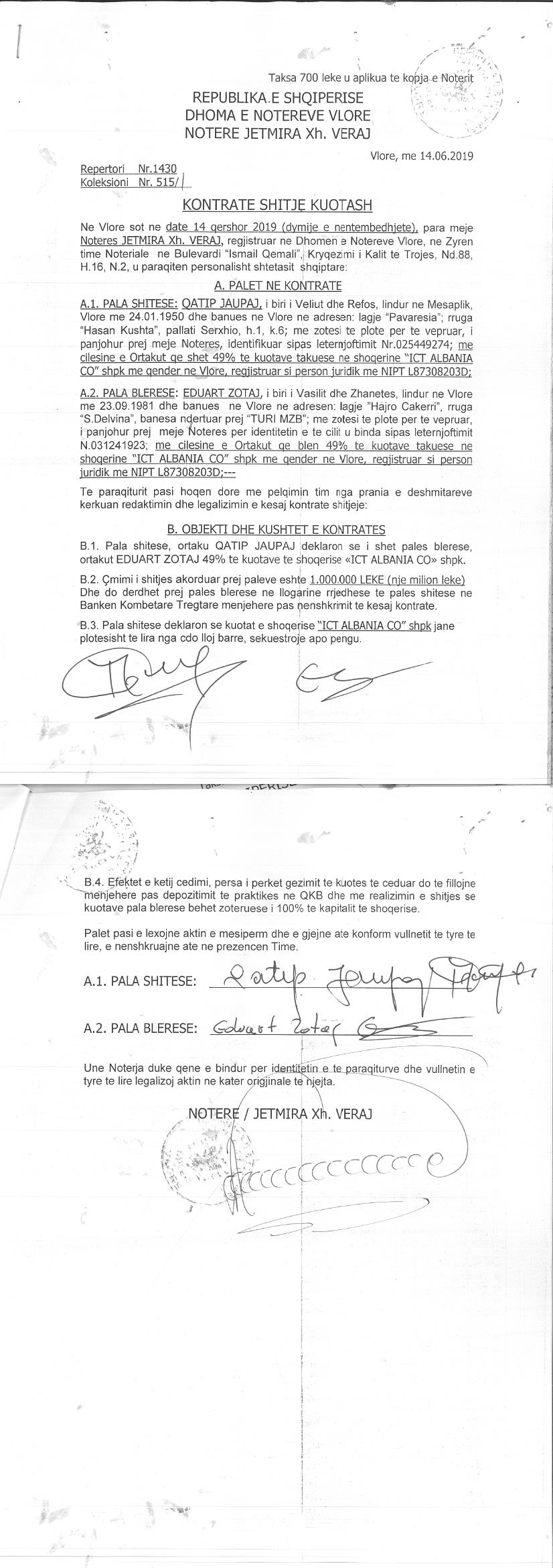 → Ekstrakti Historik i Regjistrit Tregtar date 16.12.2022 → Akt themelimi i Shoqerise → Kontrate Shitje Kuotash date 14.06.2019 |