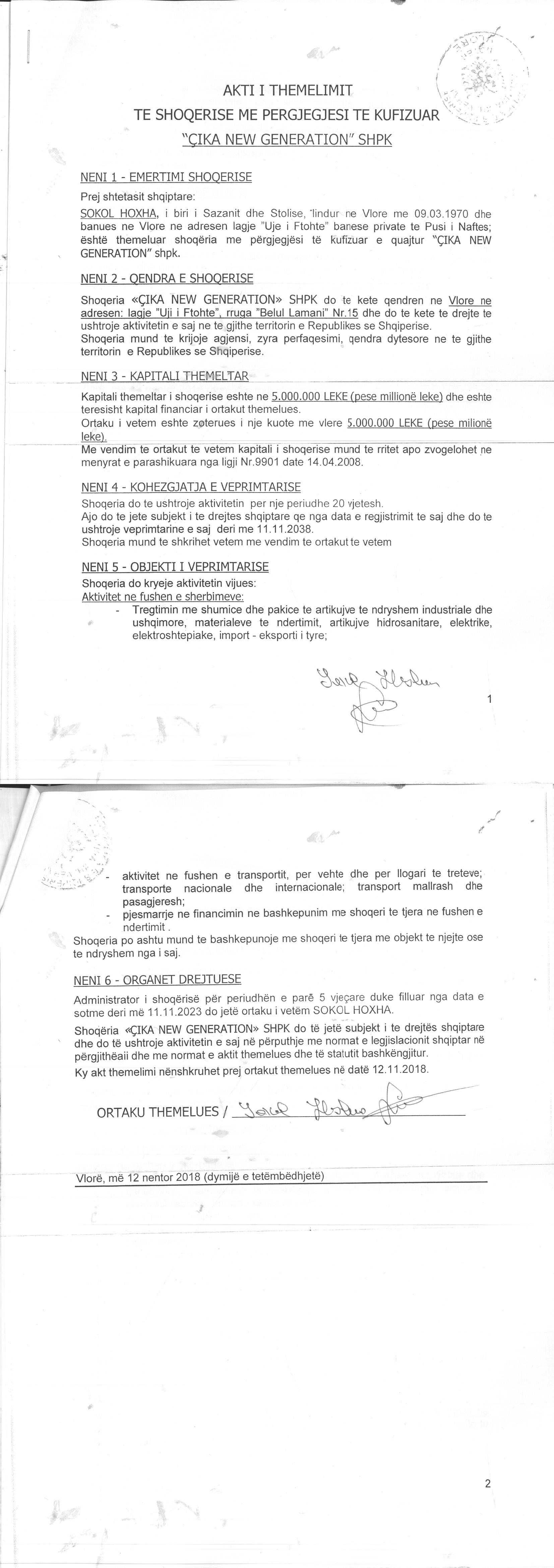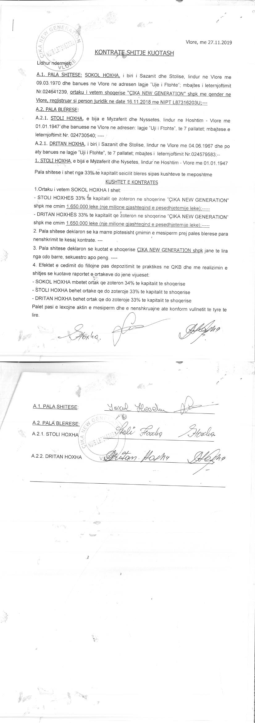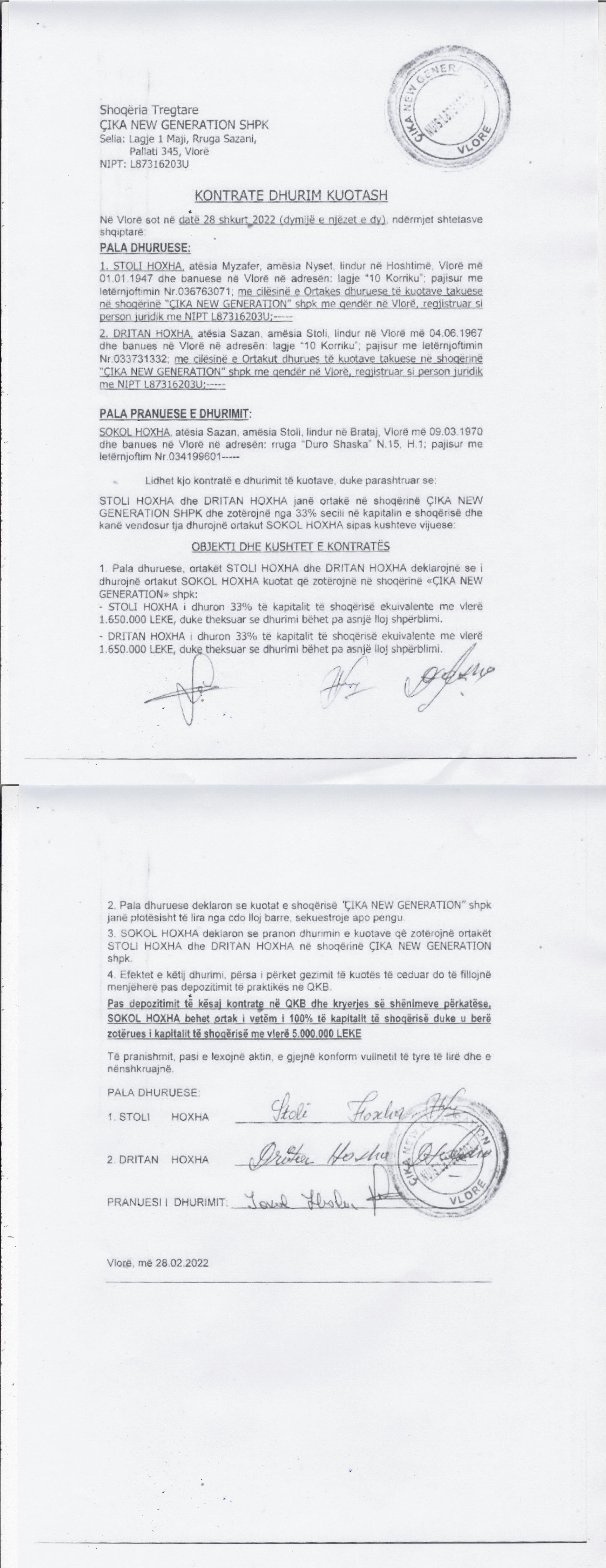 → Ekstrakti Historik i Regjistrit Tregtar date 19.12.2022 → Akt themelimi i Shoqerise → Kontrate Shitje Kuotash date 27.11.2019 → Kontrate Dhurimi Kuotash date 28.02.2022 |