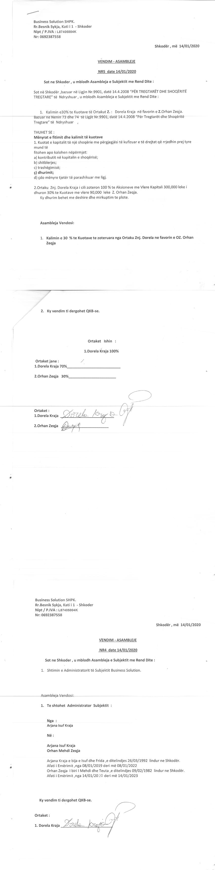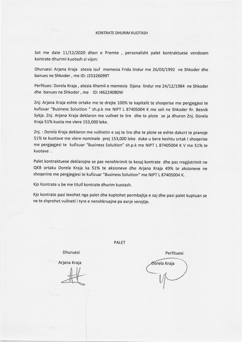 → Ekstrakti Historik i Regjistrit Tregtar date 22.12.2022 → Statuti i Shoqerise → Vendim i Ortakut te Vetem, Dhurim Kuotash date 14.01.2020 → Kontrate Dhurimi Kuotash date 05.05.2020 → Kontrate Dhurimi Kuotash date 11.12.2020 → Kontrate Dhurimi Kuotash date 06.04.2021 → Vendim i Ortakut te Vetem, Zmadhim Kapitali date 30.04.2021 |