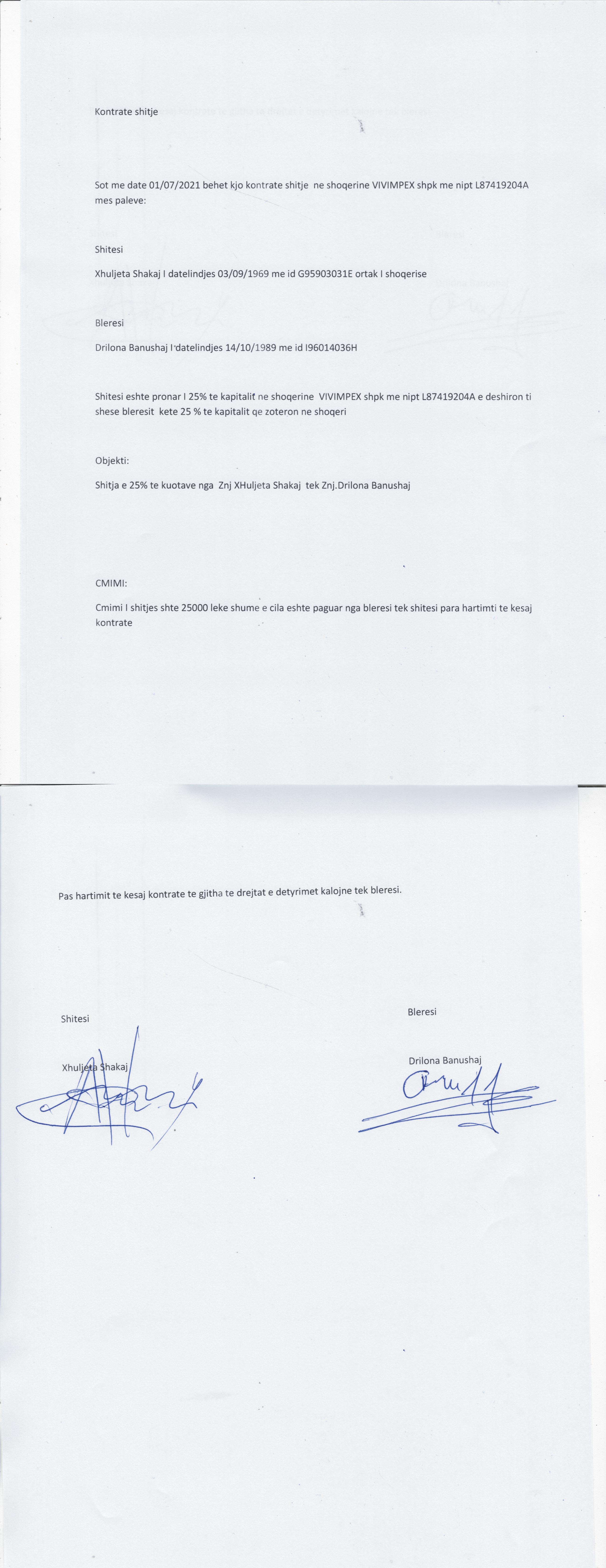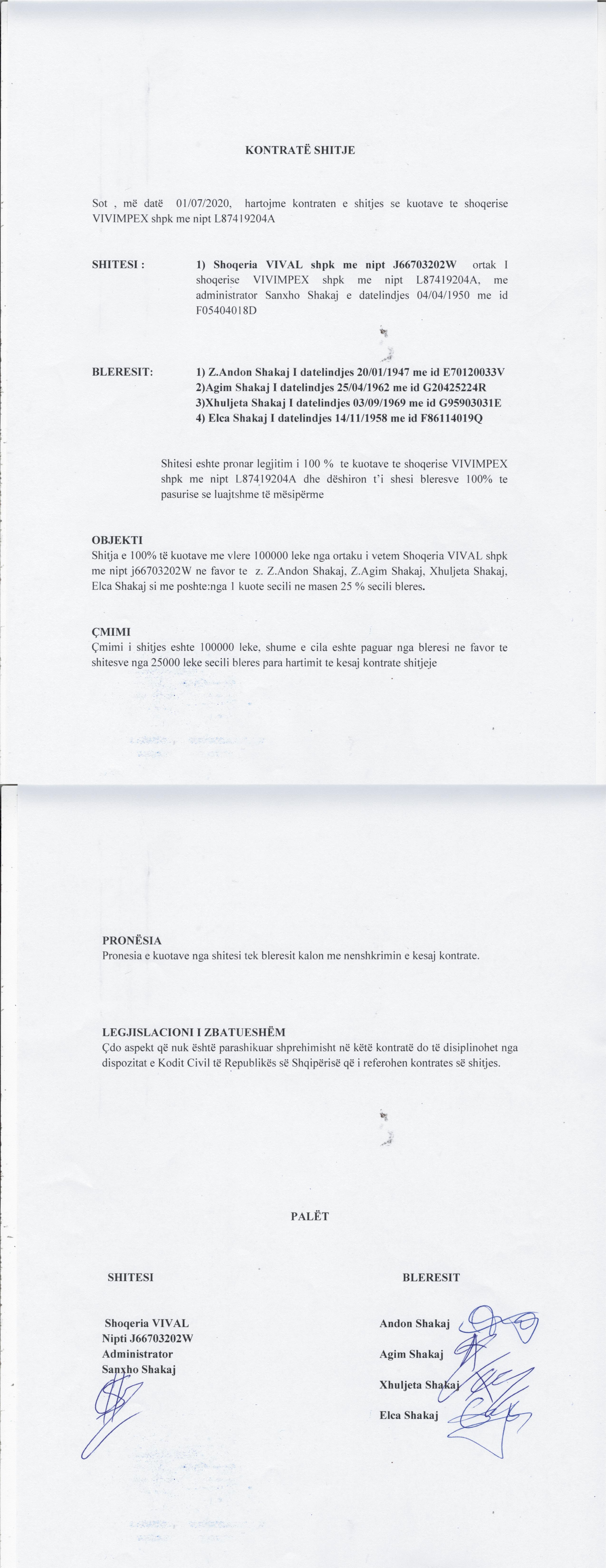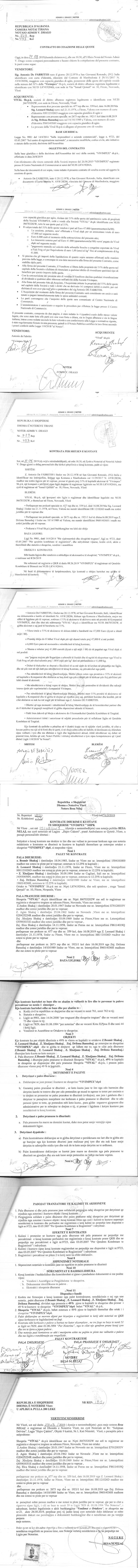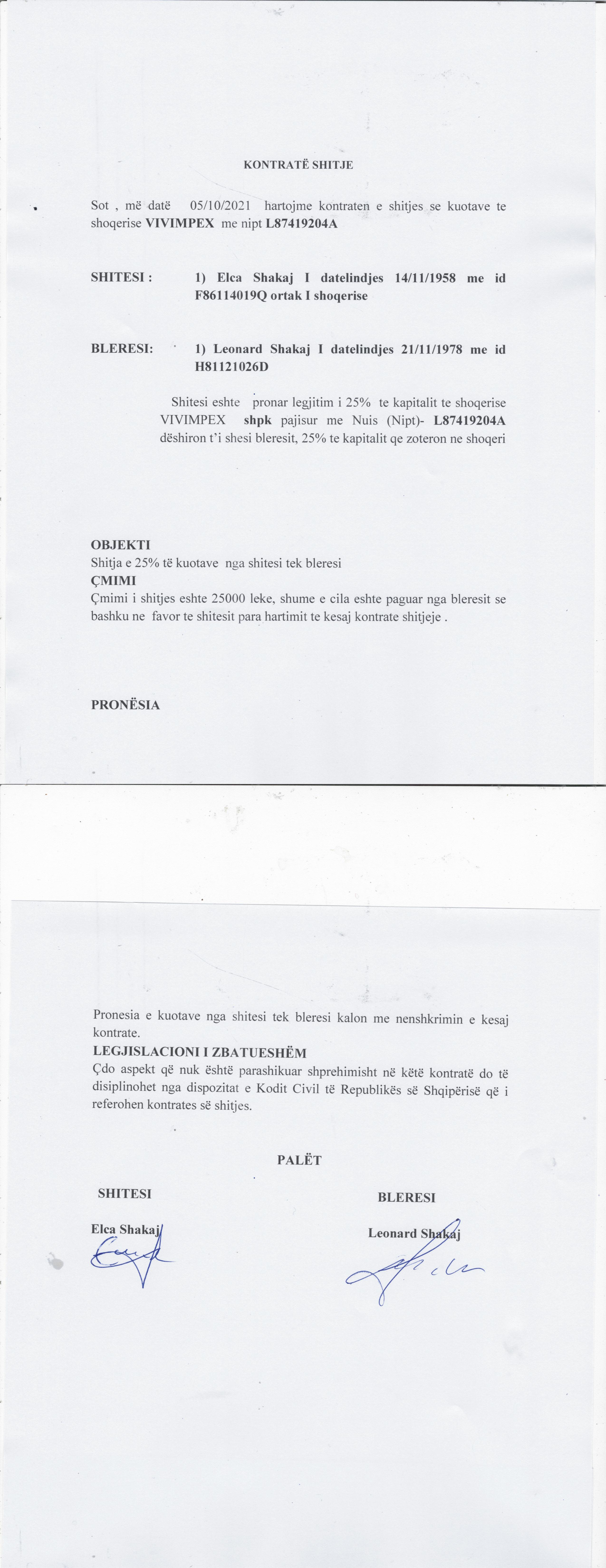 → Ekstrakti Historik i Regjistrit Tregtar date 28.12.2022 → Akt themelimi i Shoqerise → Kontrate Shitje Kuotash date 27.08.2019; Kontrate Dhurimi Kuotash date 29.08.2019 → Kontrate Shitje Kuotash date 01.07.2020 → Kontrate Shitje Kuotash date 01.07.2021 → Kontrate Shitje Kuotash date 05.10.2021 → Ekstrakt Historik i Regjistrit Tregtar date 22.05.2025 |