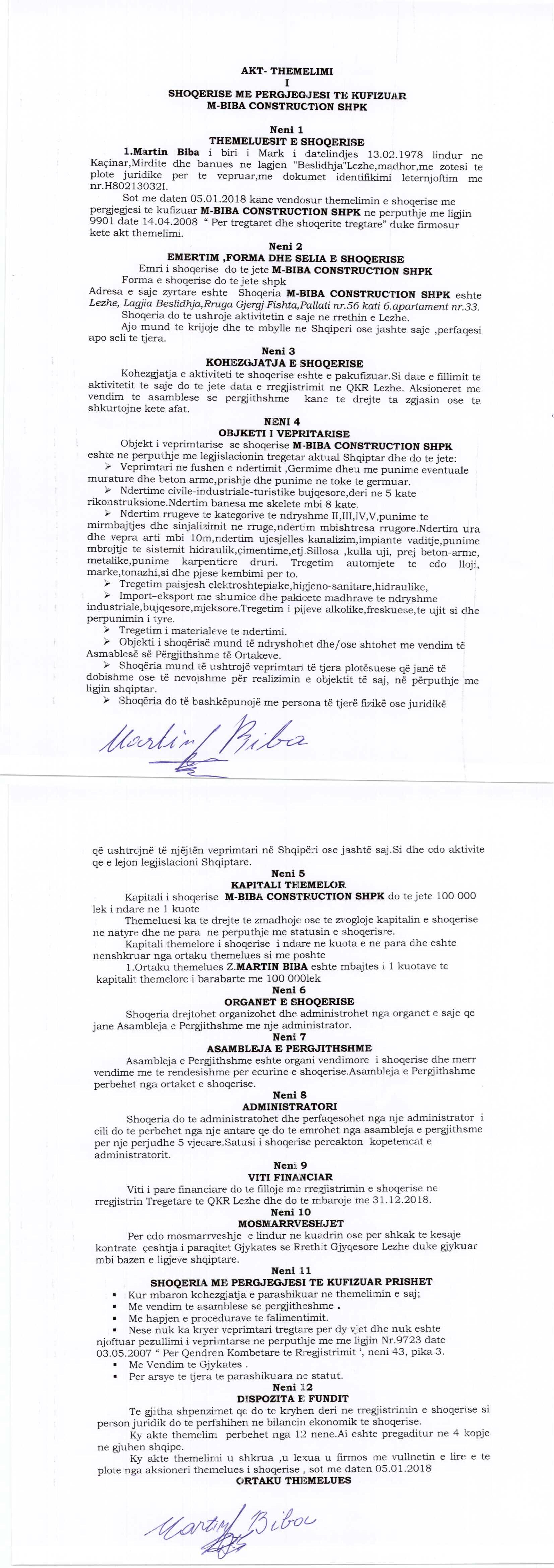 | Emërtime të tjera Tregtare: | M-BIBA CONSTRUCTION SHPK |