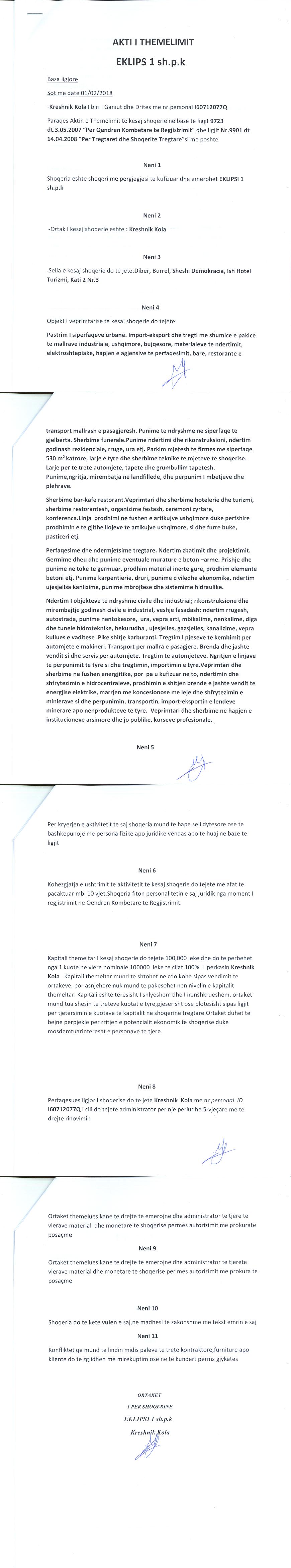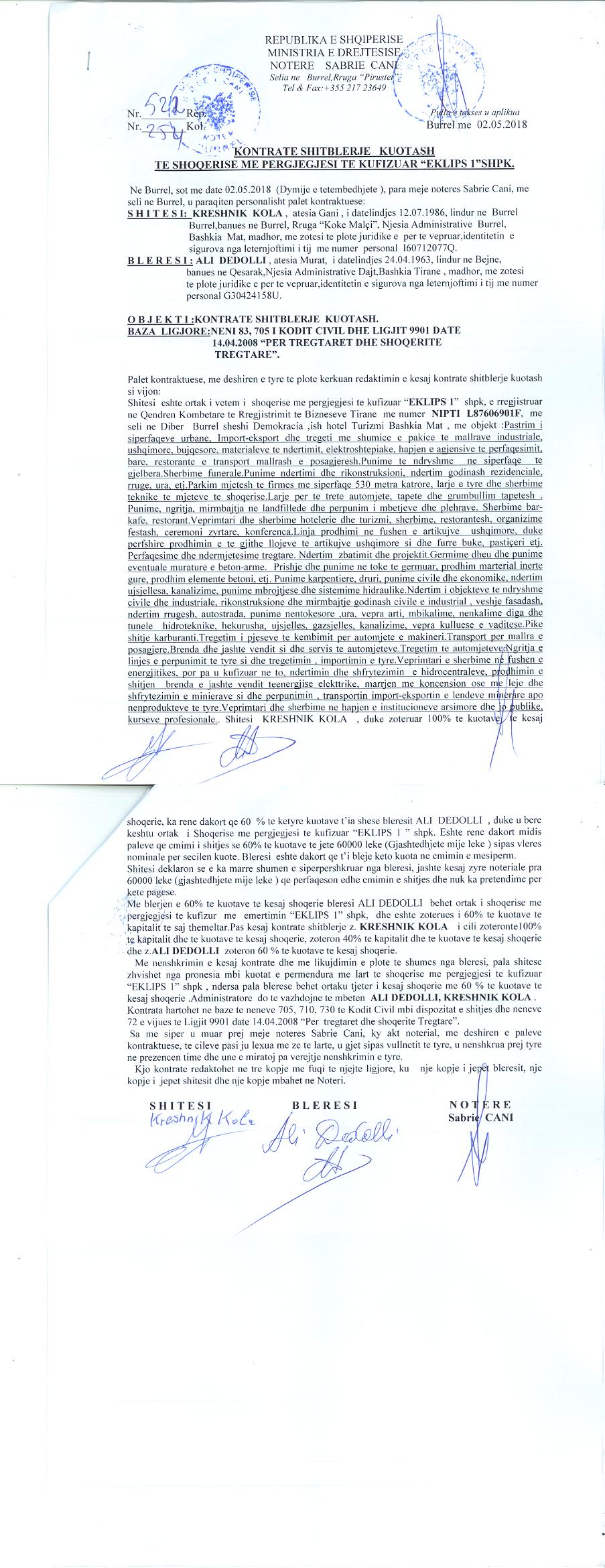 → Ekstrakt historik i regjistrit tregtar 21.01.2021 → Akti i themelimit → Kontrate shit-blerje kuotash 02.05.2018 → Kontrate shit-blerje kuotash 13.08.2020 |