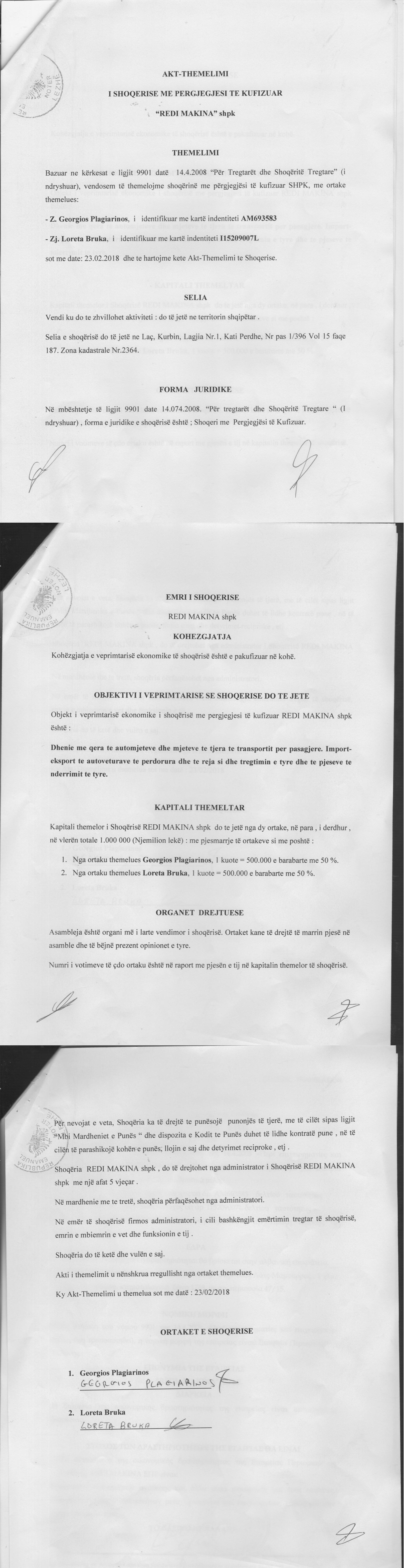 | Objekti i Veprimtarisë: | Dhenie me qera te automjeteve dhe mjeteve te tjera te transportit per pasagjere.Import-eksport te autoveturave te perdorura dhe te reja si dhe tregtimin e tyre dhe te pjeseve nderrimit te tyre. Tregtimin e aparateve dhe detergjenteve per larje te automjeteve dhe makinerive te ndryshme, vajrave, lubrifikanteve dhe antifrize. |