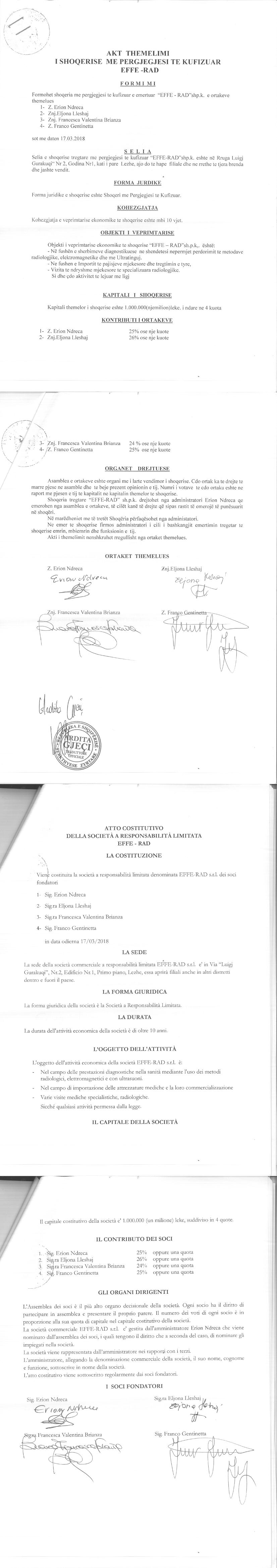 | Objekti i Veprimtarisë: | - Ne fushen e sherbimeve diagnostikuese ne shendetesi nepermjet perdorimit te metodave radiologjike, elektromagnetike dhe me ultratinguj. - Ne fushen e importit te pajisjeve mjekesore dhe tregtimin e tyre. - Vizita te ndryshme mjekesore te specializuara radiologjike. Si dhe çdo aktivitet te lejuar me ligj.-Pathologji - Pediatri - Kirurgji - Kardiologji - Neurologji - Psikiatri - Nefrologji - Reumatologji - Okulistike - ORL - Dermatologji - Gastroendologji - Endokrinologji - Ortopedi - SëmundjeProfesionale - SëmundjeOnkologjike - Infektiv - Sëmundjeturbekulare - Sëmundjet e Gjakut - SëmundjetAlergjike - Obstetri - Otojati - Radioligji - Kardiopediatri - Reumopediatri - Flebologji - Gjinekologji - Pneumo- Ftiziatri - Hepatologji - MjekLaborant - Urologji - Hemapediatri - Alergopediatri - Infeksionistpediatër - NeuroPediatër - Mjek –Urgjence - Mjek –Konsulte - Anestezist - KonsultorFëmije - Neonatolog - Obsteter- Gjinekolog - Neuro- Psikiatër - Pneumolog - Stomatolog - Bar-Kafe – Fastfud. |