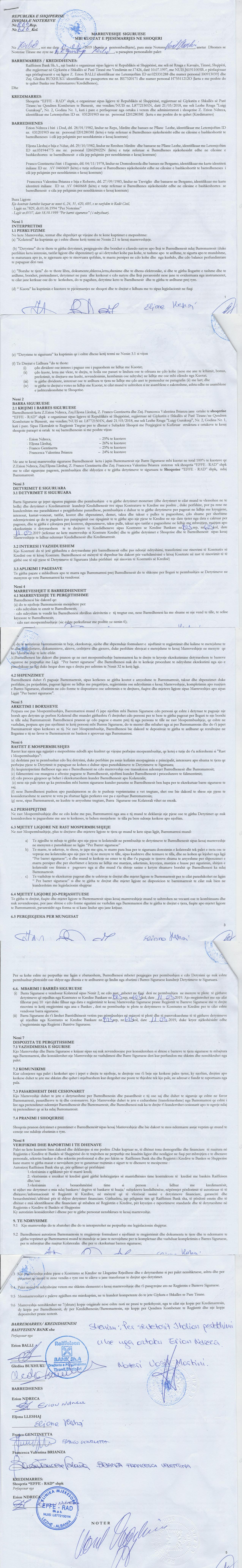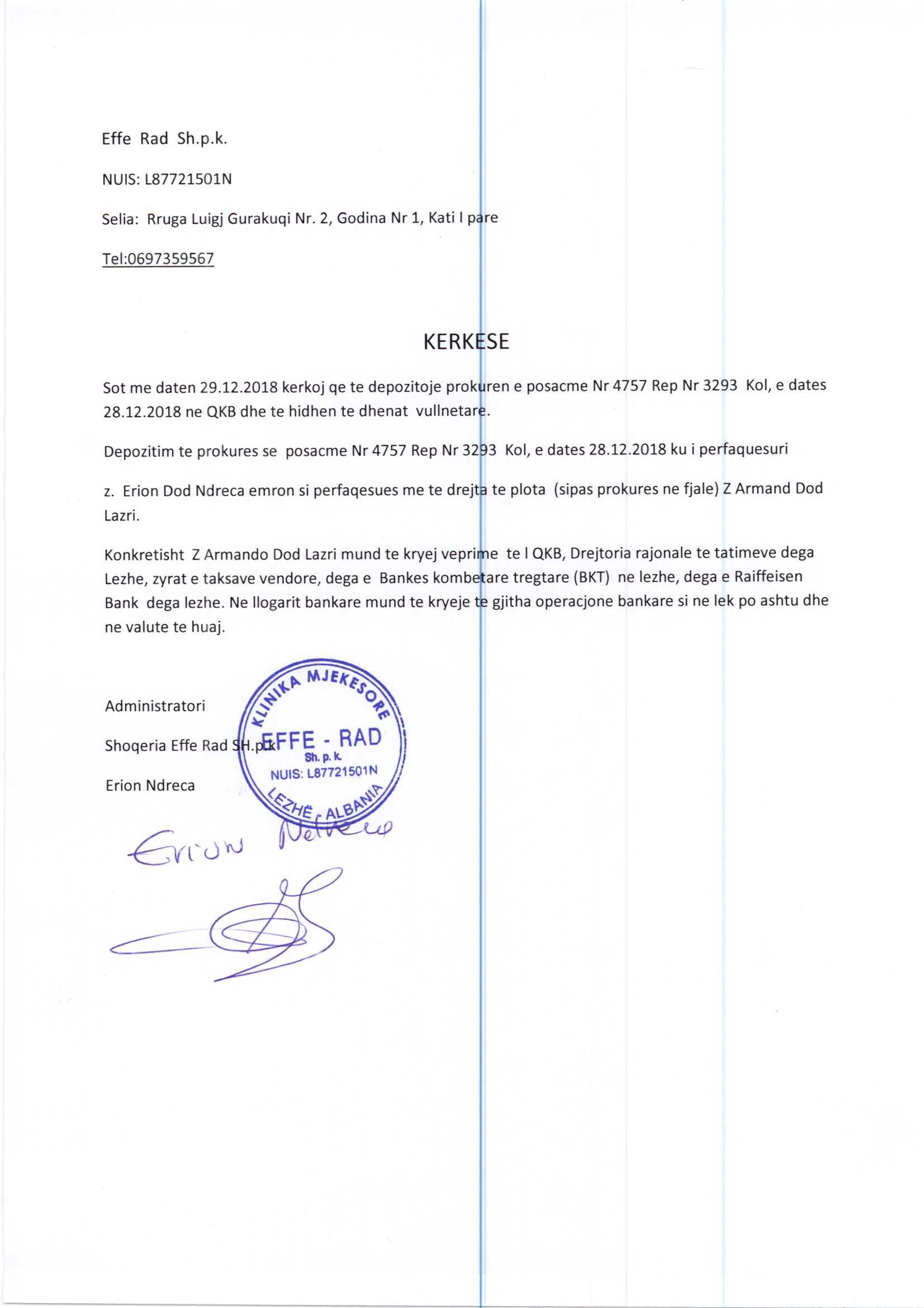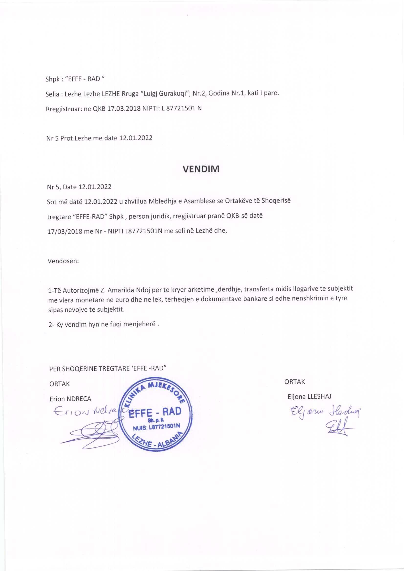 | Çështje Ligjore: | I. Me date 03/01/2019, me ane te prokures Nr. 4757 Rep. Nr. 3293 Kol. date 28.12.2018, leshuar nga z. Erion Ndreca ne cilesine e administratorit te shoqerise "EFFE -RAD" sh.p.k, mbi bazen e se ciles perfaqesuesit z. Armand Lazri i jepen tagrat e percaktuara ne kete akt. II. Me date 12/04/2019, me ane te Marreveshjes Siguruese Nr. 866 Rep. Nr. 626 Kol. date 11.03.2019. III. Me date 13/01/2022, me ane te vendimit datë 12.01.2022 për autorizimin e znj Amarilda Ndoj për të kryer arkëtime, derdhje, transferta midis llogarive të subjektit me vlera monetare në euro dhe në lekë, tërheqjen e dokumentave bankare si edhe nënshkrimin e tyre sipas nevojave të subjektit. |
