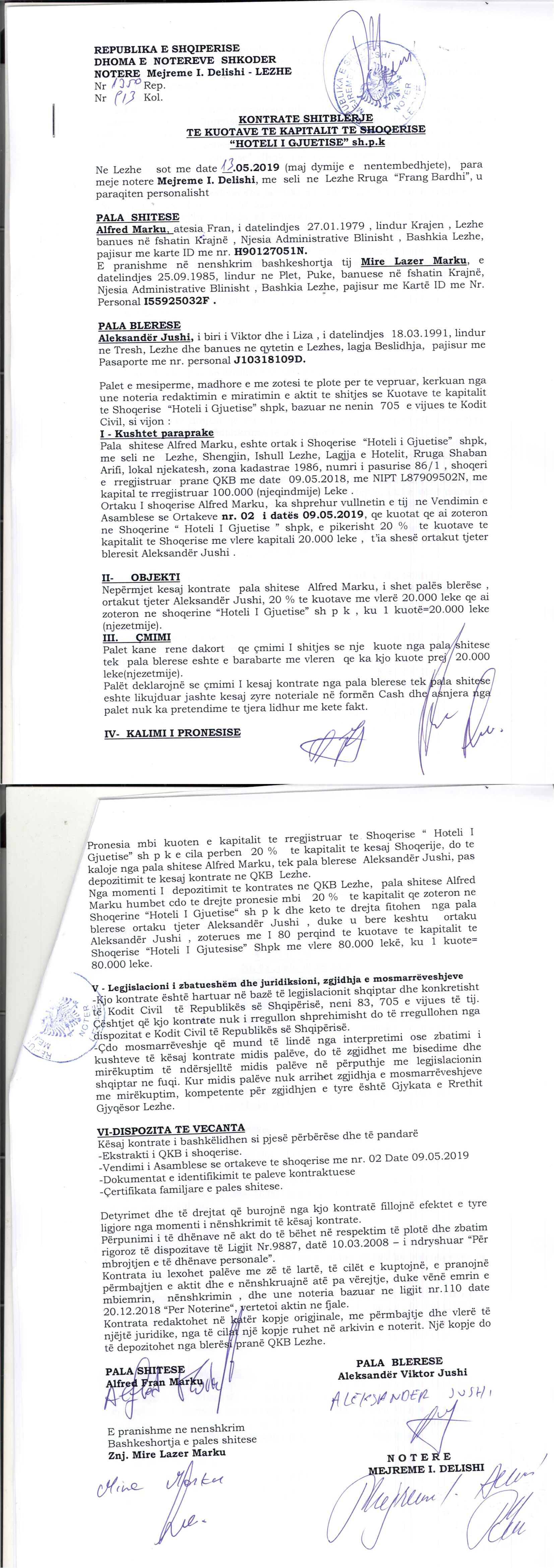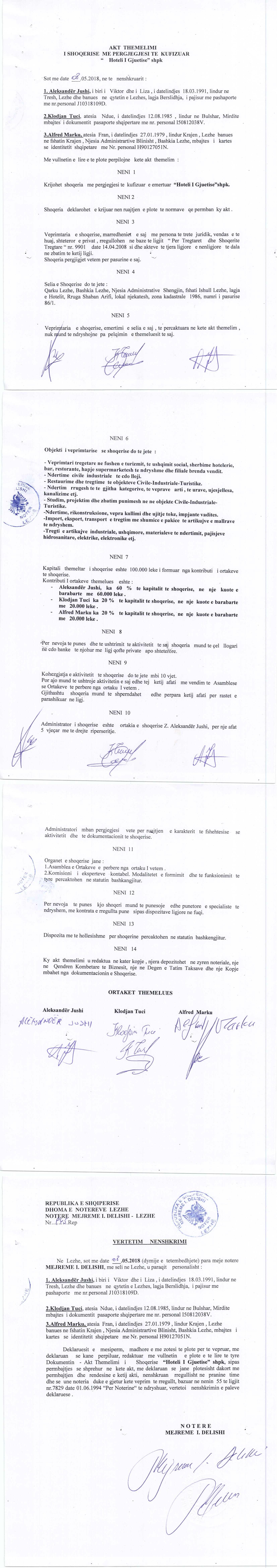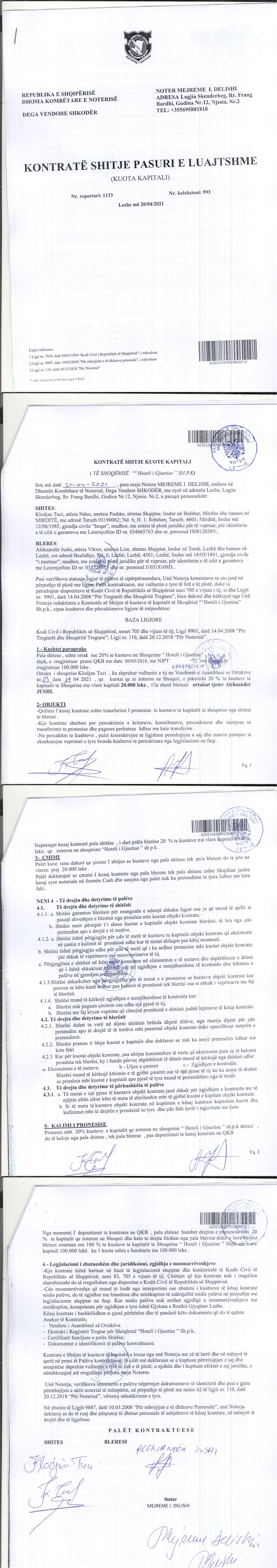 → Ekstrakti Historik I Regjistrit Tregtar date 13.10.2022 → Akt themelimi i Shoqerise → Kontrate Shitblerje Kuotash, date 13.05.2019 → Kontrate Shitje Kuotash, date 20.04.2021 |