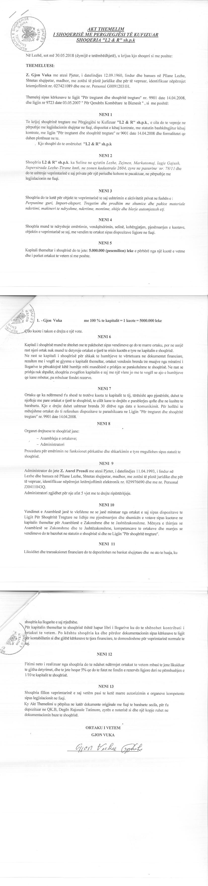 | Emërtime të tjera Tregtare: | "L 2 & R" SH.P.K. |